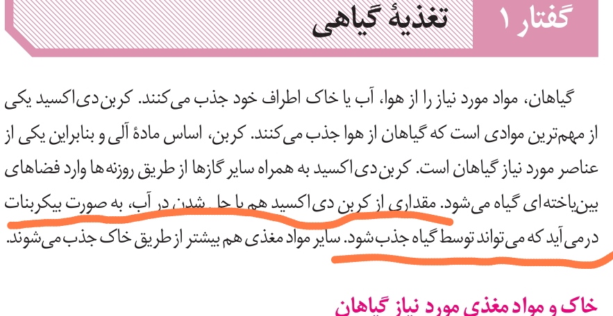 سلام توی کتاب ذکر شده که جذب گیاه هم از آب وهم از خاک و هم از هوا اما استاد فقط خاک و هواشو گفتن الان نمیدونم که از آب جذب هم میشه صورت بگیره یانه؟