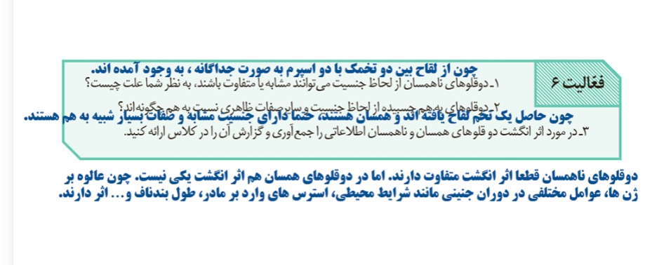 سلام وقت بخیر سوال سوم رو در این فعالیت استاد درحل نمونه سوالات جور دیگه ای جواب دادن گفتن که دوقلو های همسان اثر انگشت هاشون هم کاملا مشابه هست جواب درست و قابل قبول رو میشه لطفا بهم بگید