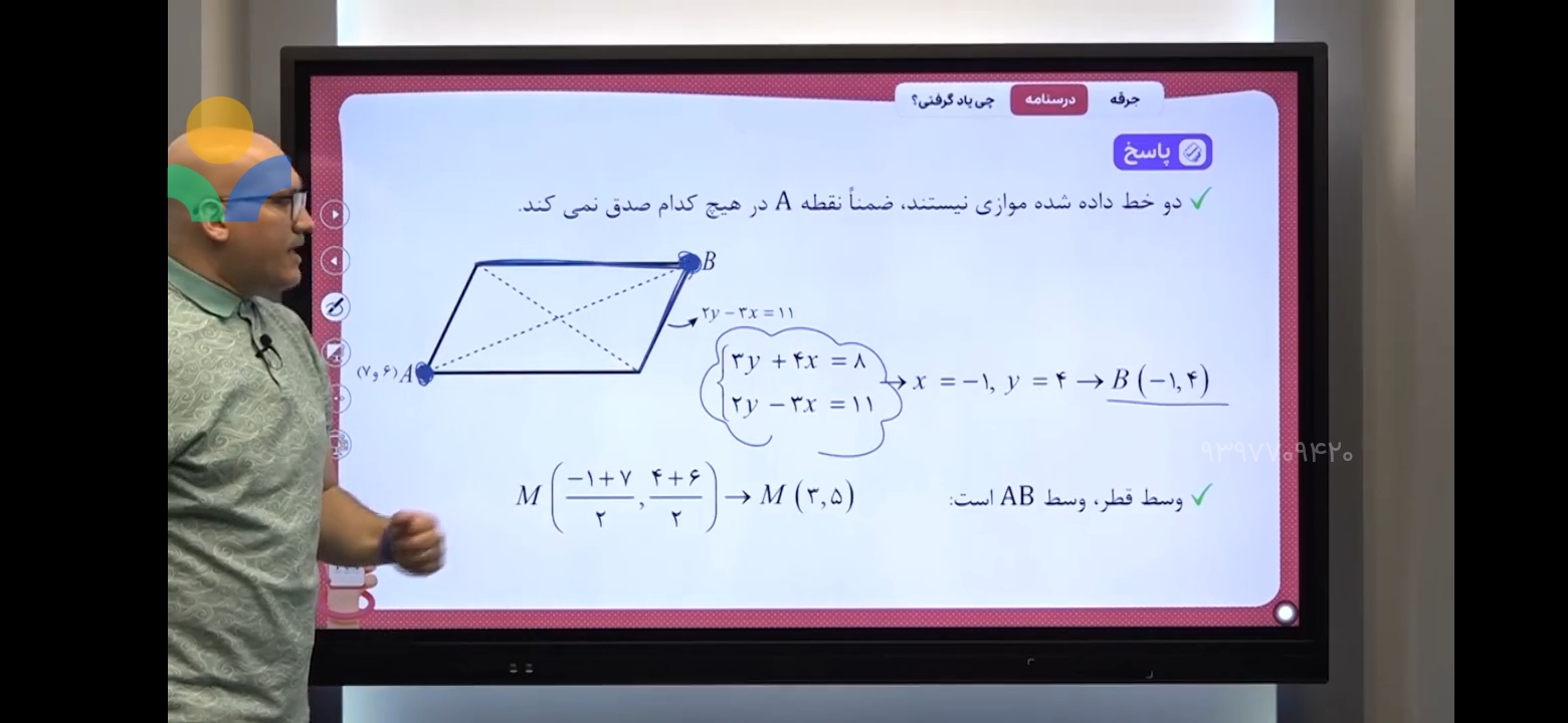 سلام ممکنه این قسمت اخر و که a,bرو پیدا میکنه رو با دو معادله دو مجهول رو یکی توضیح بده رو کاغذ ؟؟؟ من هرکاری میکنم جواب درست در نمیاد