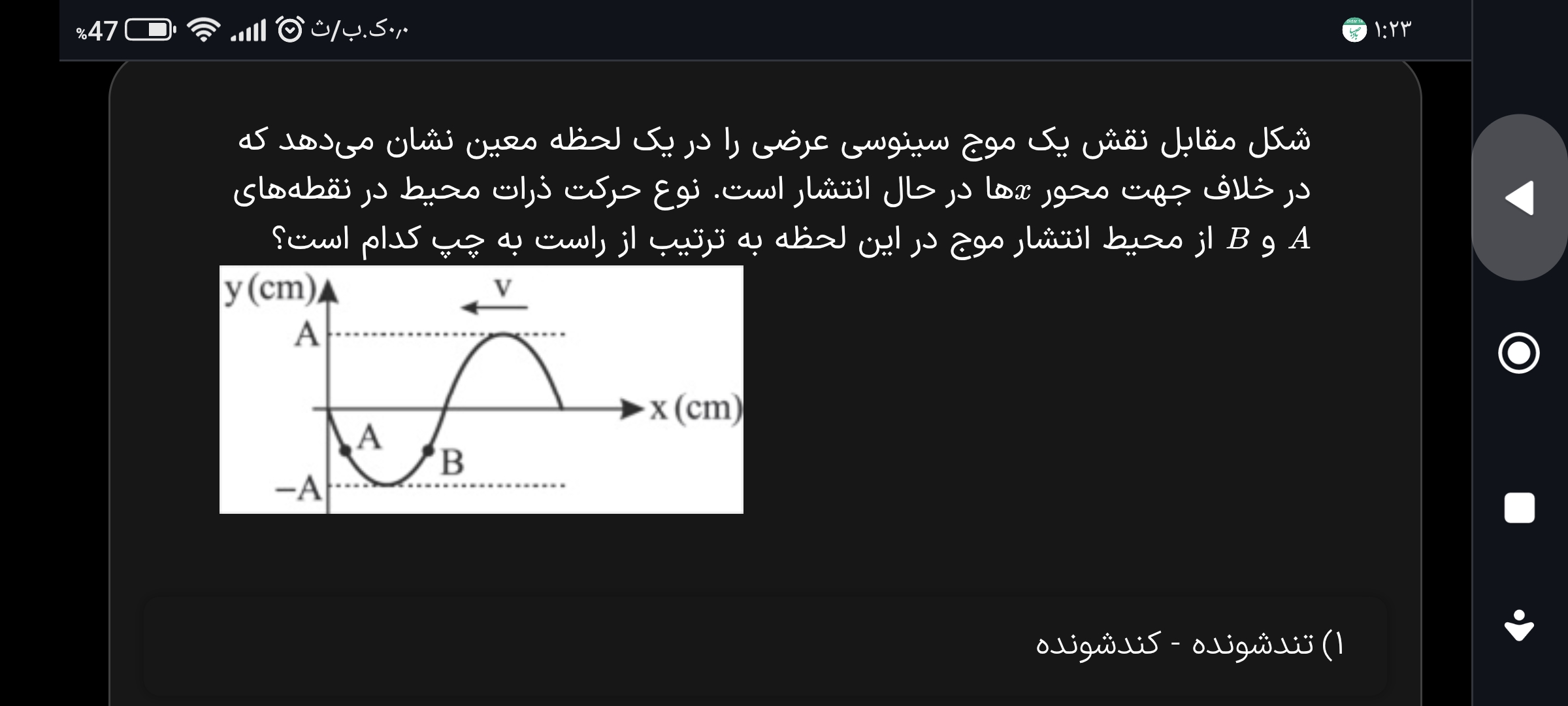 جهت موج به سمت راست هستش چرا ذره B برای رسیدن ب مثبت دامنه باید 3 لاندا چهارم طی کنه؟؟؟ فاصله ش مگه ب. اندازه لاندا چهارم نیست؟؟؟؟