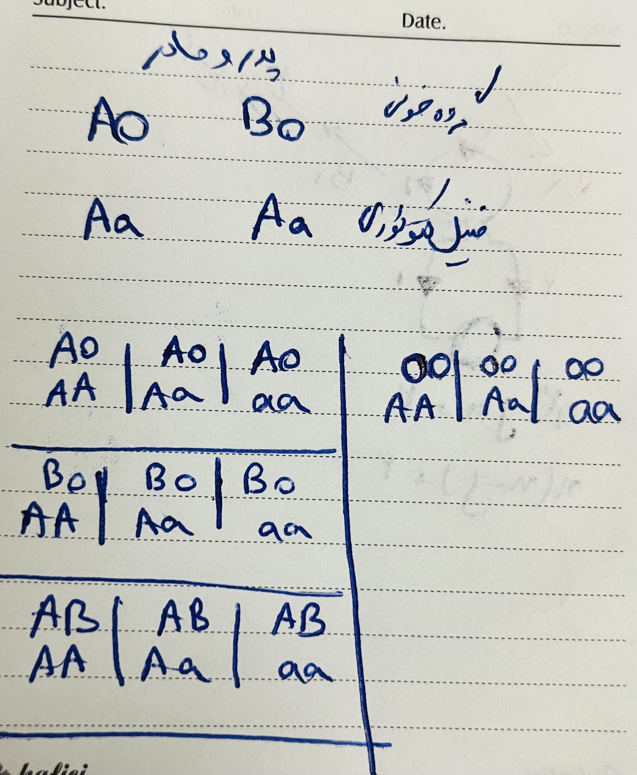 سلام مثلا اگه پدر خانواده ژن نمود AB داشته باشه و مادر و پسر AO باشن نمیشه دیگه پس ودر نمیتونه هر ژن نمودی داشته باشه