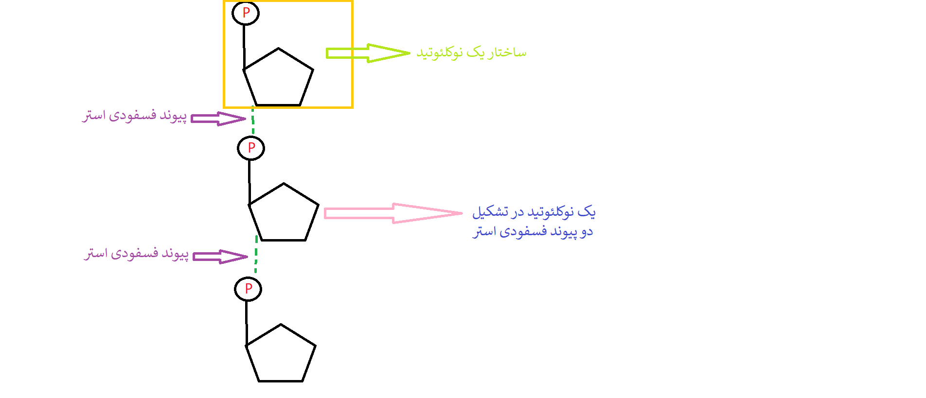 ببخشید من متوجه نشدم چطور هر نوکلئوتید در تشکیل دو پیوند فسفودی استر شرکت میکنه میشه بیشتر بهم توضیح بدین؟؟؟