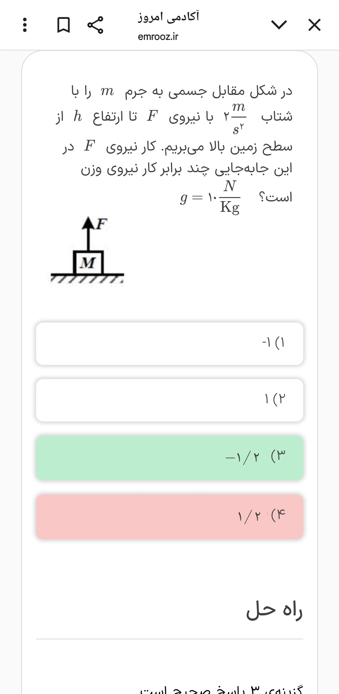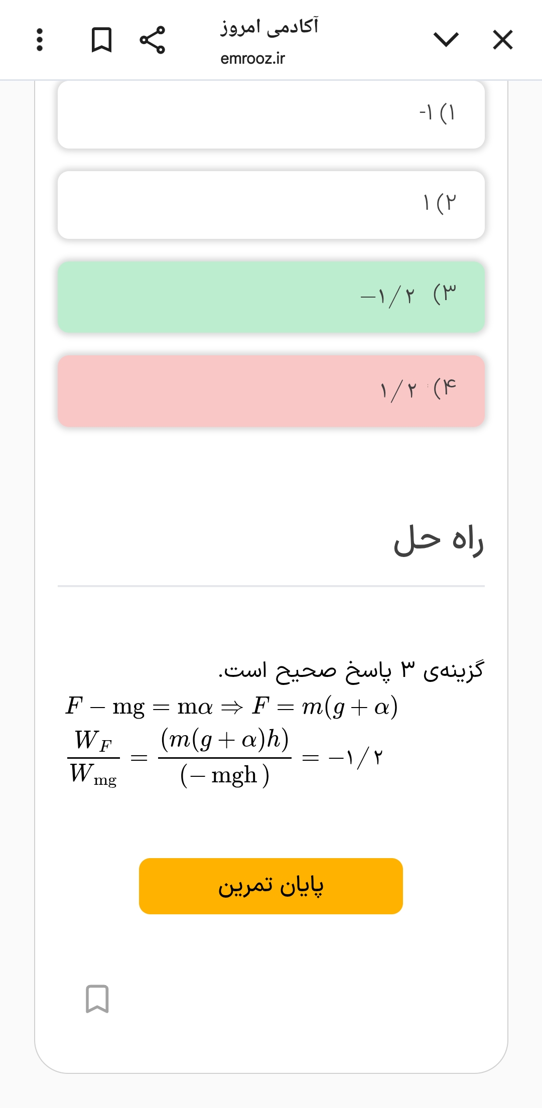 اینجا اگه طبق فرمول f net بریم جلو؛ازونجایی که a صفره کار وزن و قرینه کار نیرویf برابر میشن پس نمیشه بگیم منفی یک درسته)گزینه اول(