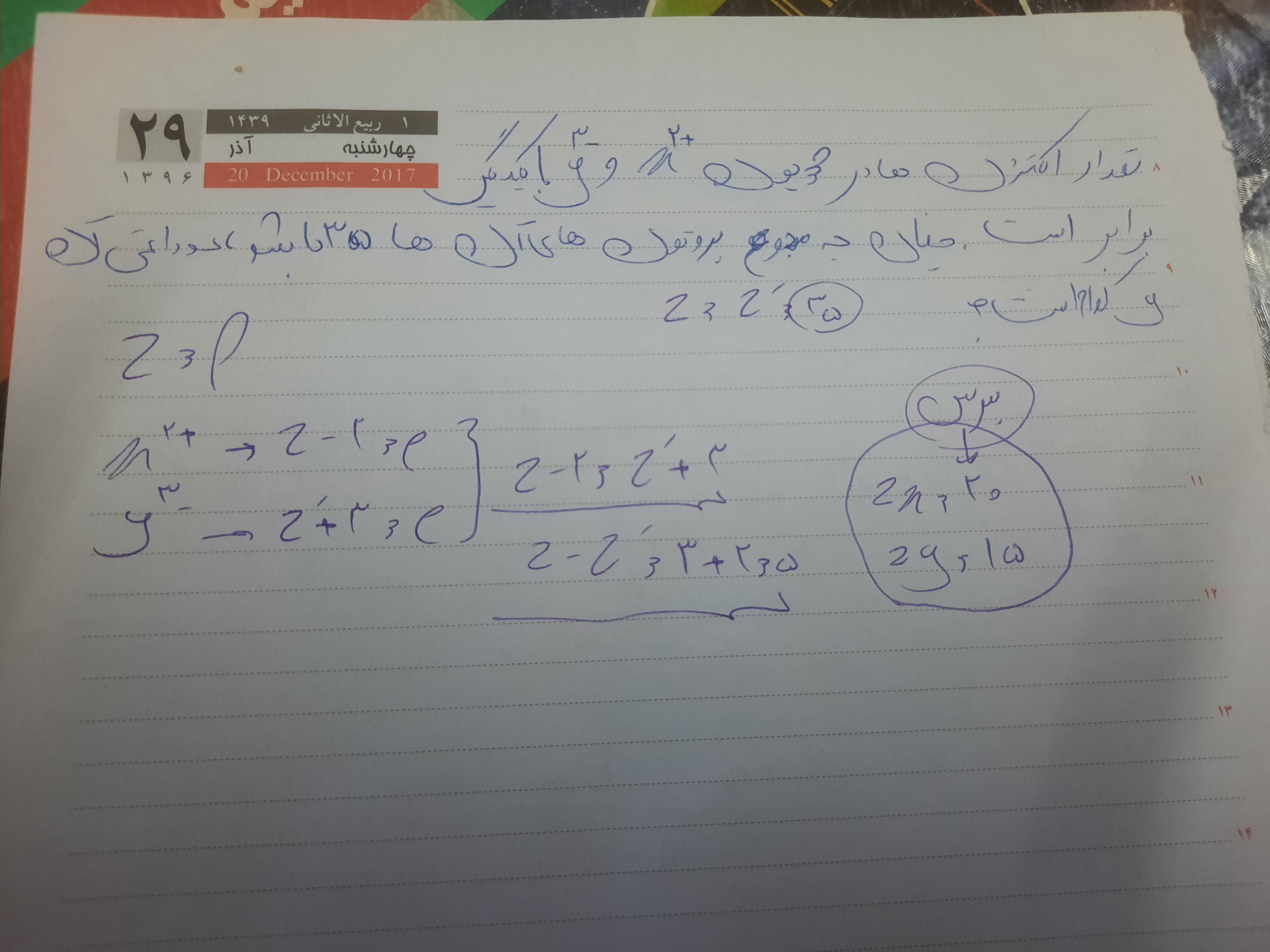 سلام. عنصر X سه تا الکترون گرفته که شده یون ۳-. عنصر Y دوتا تا الکترون از دست داده که شده یون ۲+. اگر تعداد الکترون های عنصر X رو x در نظر بگیریم، تعداد الکترون یون ۳- میشه x+3. و اگر تعداد الکترون های عنصر Y رو y در نظر بگیریم، تعداد الکترون یون ۲+ میشه y-2. معادله مینویسیم و اینها رو برابر قرار میدیم. و میفهمیم تعداد الکترون یا پروتون عنصر Y پنجتا از عنصر X بیشتره.