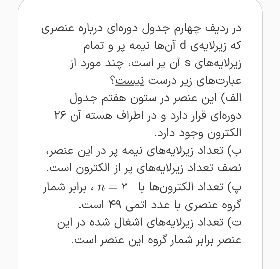 سلام برای گزینه سوم میتونیم از یه زاویه ی دیگه بهش نگاه کنیم که غلط بشه حسابش کرد؟ من این گزینه سوم و اشتباه گرفتم چون که این فرمول ظرفیت گنجایش الکترونی در (یک زیرلایه )رو مشخص میکنه نه (زیر لایه ها )