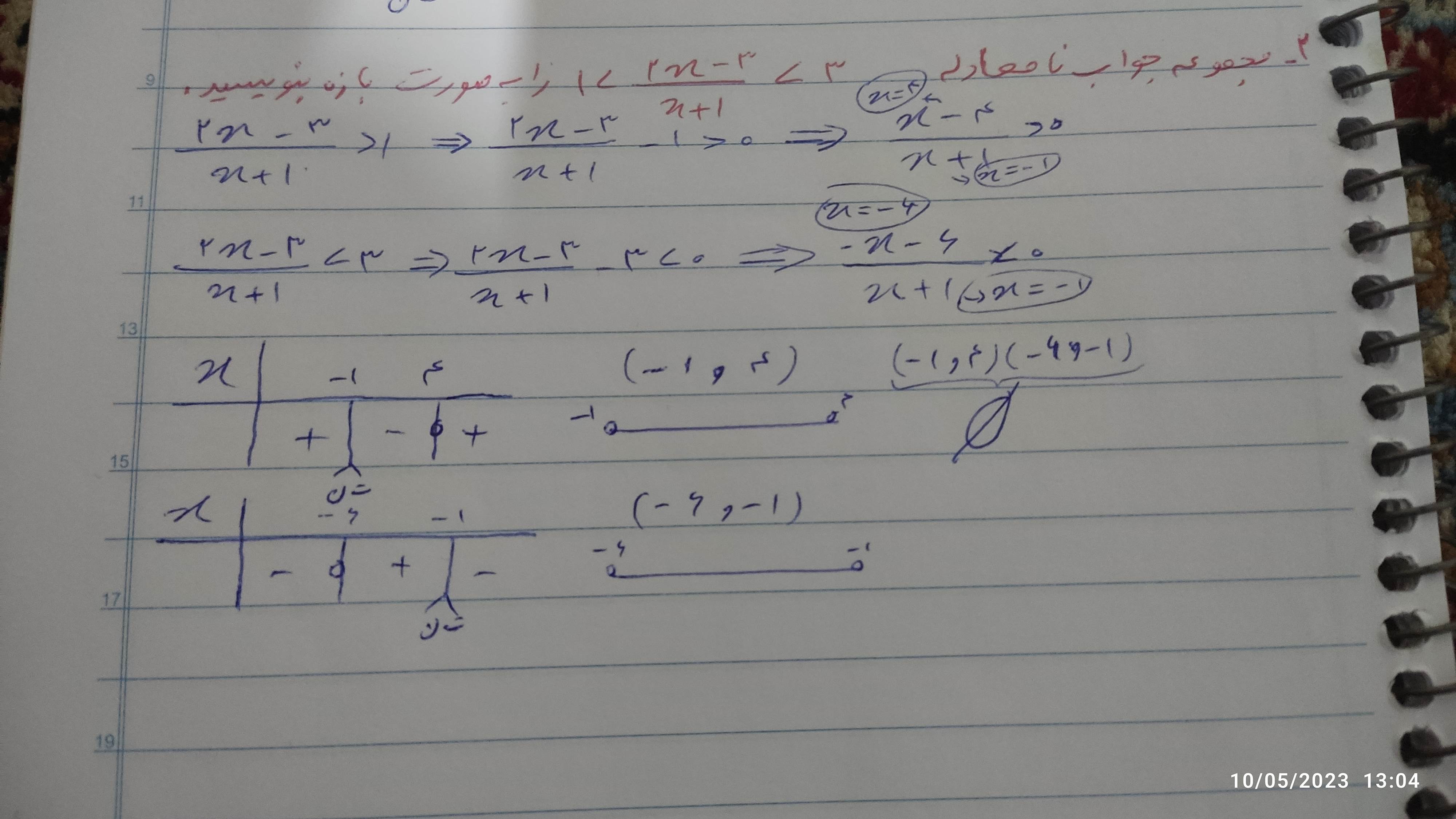 https://emrooz.ir/cbgstbc-1311?comment_id=711492#comment-711492 سللم جناب رشادی، وقت بخیر صورت رو اگر تجزیه کنیم میشه : (X+2) (X_4) بنابراین ریشه هاش میشه : ۴ و ۲-. مخرج هم که بود X²+4 که من تجزیه کردم ، اینطوری شد: (X_2) (X+2). بنابراین ریشه هاش میشه : ۲- و ۲. خب الان میتونیم ریشه هایی که توی صورت و مخرج مثل هم هستن رو خط بزنیم، پس (X+2) خط میخوره. و در نهایت کل عبارت میشه : (X-4) به روی (X-2). جدول تعیین علامتش هم اینطوریه که ، یه ریشهی ۲ و یه ریشهی ۴ میزاریم. ریشهی ۴ صفر میکنه( چون برای صورت هست) و ریشه ی ۲ ت.ن میشه( چون برای مخرج هست). اما ریشههایی که استاد به دست آوردن ۴ و ۲- بود!! خب در ادامه باید بگیم علامت خونهی اول از سمت راست میشه مثبت. و چون ریشهی مضاعف نداریم باید یکی در میون تغییرش بدیم. حالا چون باید 0> باشه( یعنی کل عبارتمون کمتر از صفر بود) باید اون قسمتی از جدول رو انتخاب کنیم که کمتر از صفر هست... جوری که من حساب کردم بازهاش میشد (منفی بینهایت و ۲) !!! و اینطوری اصلا به جواب نرسیدم! اشکال کجاست؟