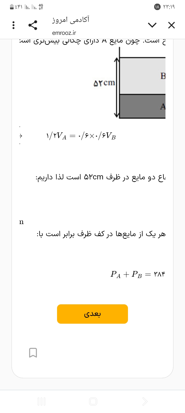 این سوال رو نمیشه به جای نوشتن نسبت pB/pA بگیم چون فشار B برابر است با فشار A به اضافه فشاری که اون پنجاه سانتی متر وارد میکنه اینجوری نویسیم pA+pgh/pA من اونجوری رفتم جواب اشتباه اومد
