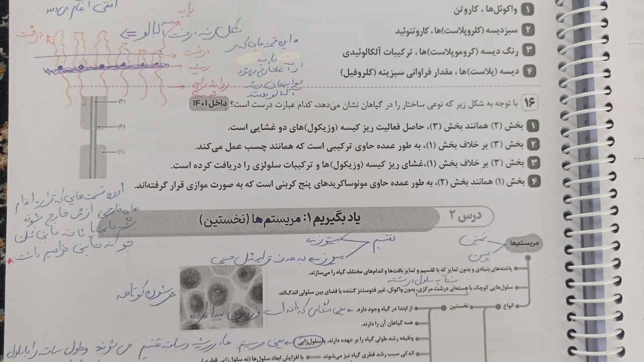 سلام وقت بخیر این سوال پایین رو تصویر خود تست بالاش فرستادم و یک سوال دیگه هم داشتم اینکه در گیاهانی که فتوسنتز نمیکنن مثل سس و گل جالیز که نگهبان های وزنه اشونم متفاوته؟ چون فتوسنتز نمیکنن خب...؟