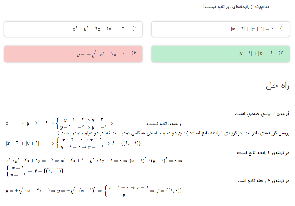 سلام روز خوش ببین این گزینه طوری هست که هر کدوم از عبارتا هیچ جوره منفی نمیشه چون یکیش قدر مطلق داره اونیکی توان ۲،و اینکه جواب مجموع اینا شده ۰ که این اعداد حتما باید صفر بوده باشن دیگه تا جواب صفر بشه وگرنه اگه حتی یکیش ۱ باشه جواب بزرگتر از ۰ در میاد،حالا برا اینکه بفهمیم تابع هست یا نه هر کدوم رو مساوی صفر قرار میدیم تا ببینیم مقدار مجهول ریشه ما چنتایی در نیاد که اینجا x=0 میشه و عبارت دوم رو مساوی صفر قرار بدیم ریشش یدونه فقط ۱ در میاد پس این عبارت تابع هست.