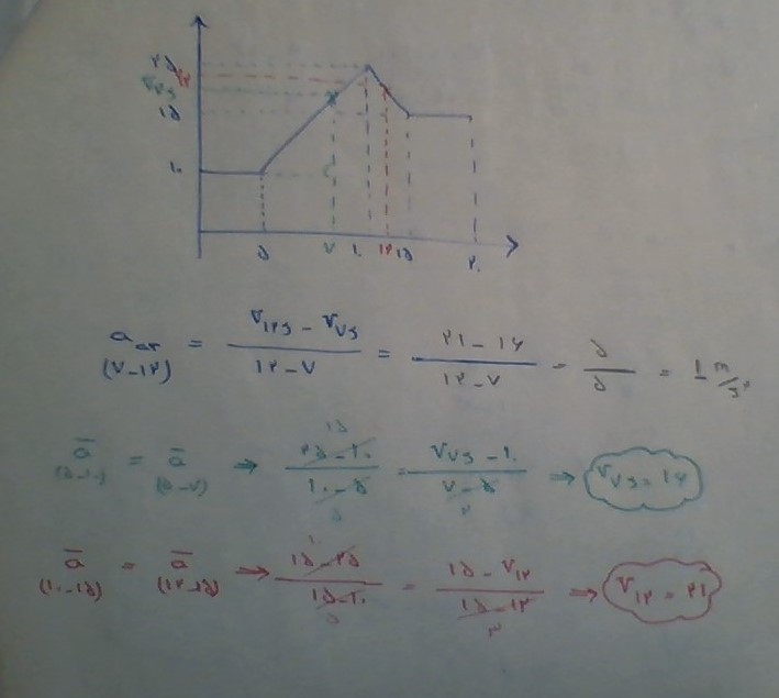 سلام من این سوالو کلا نفهمیدم ولی من از این روش رفتم که شتاب در بازه ۵ تا ۱۰ ثانیه شتاب متوسط هست پس اگر از طریق تانژانت شتاب رو در این بازه حساب کنیم در واقع شتاب ۷ ثانیه که بین ۵ تا ۱۰ ثانیه هست رو حساب کردیم و همین کار رو برای لحظه ۱۲ ثانیه هم انجام میدیم بعدش از طریق فرمول a=v/t سرعت رو در لحظات ۵ و ۱۲ حساب میکنیم و از طریق فرمول شتاب متوسط من بهجوااب ۳/۵ رسیدم میخواستم بدونم چرا جواب و روش من غلطه