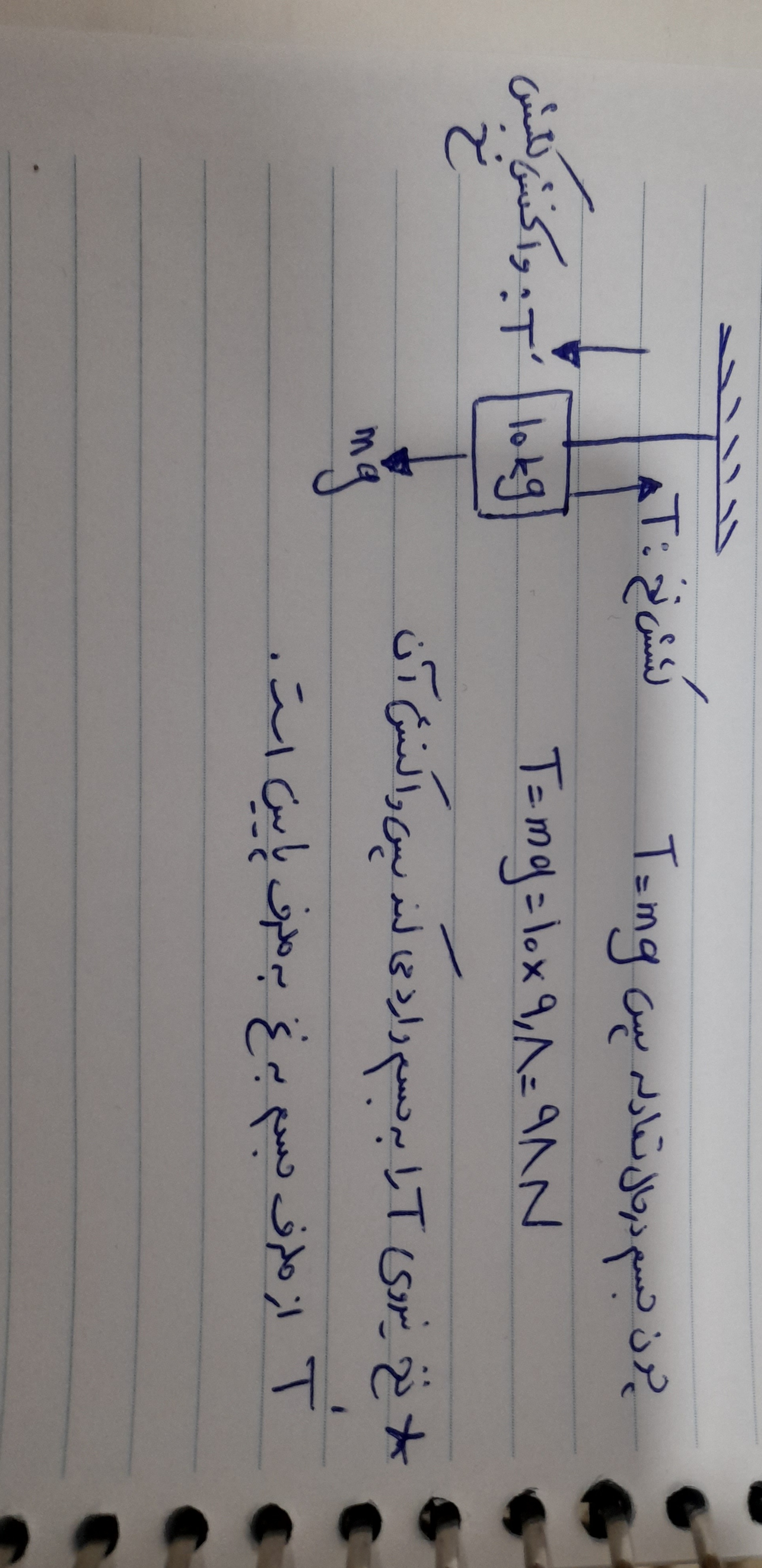 درود بر شما..خسته نباشید ببخشید برای یادبگیریم یک قسمت (ب) نیروی کشش نخ T هست درسته؟ بعد میگیم برای اینکه نیروی کشش نخ رو حساب کنیم فرمولش میشه T=mg که جواب میشه..T=10*9/8 T=98 درسته؟