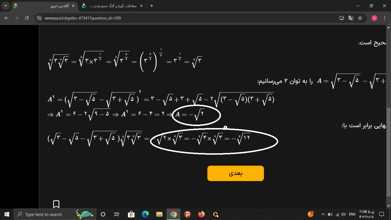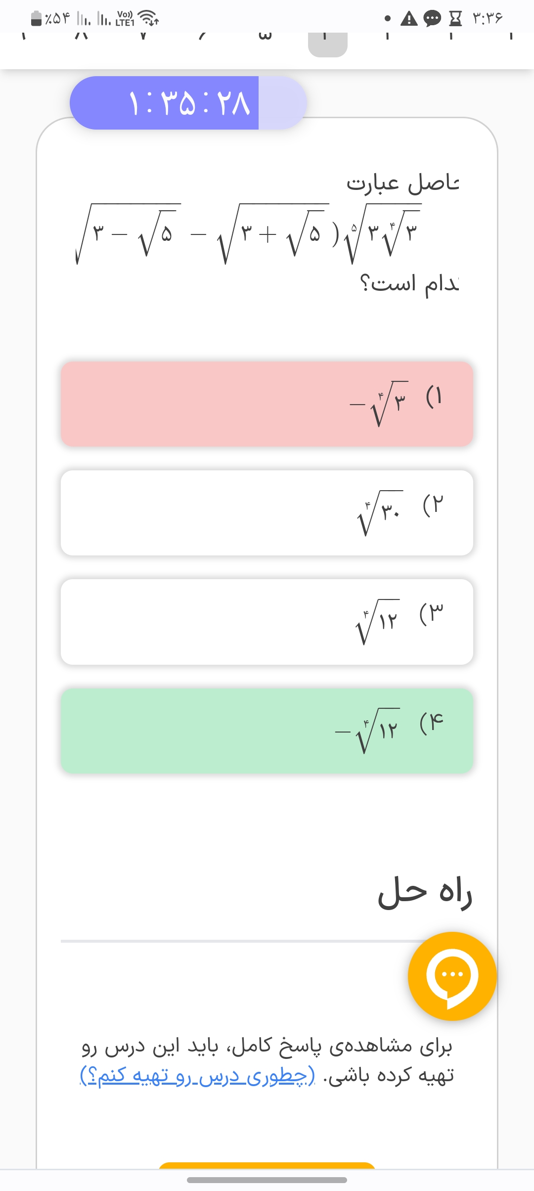 سلام زیر رادیکال این فورجه ۴ عبارتش رو ساده کنی میشه (۳ منهای ۲رادیکال دو) به توان ۲ حالا این توان دو با فورجه ۴ ساده میشه