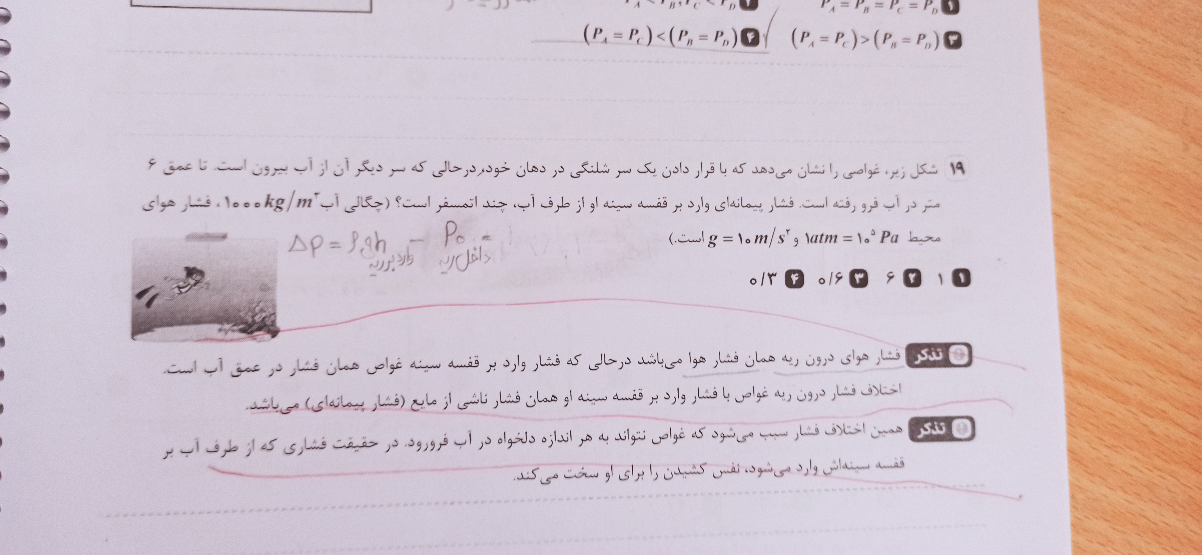 سلام با توجه به 2تا نکته اول بیا فشار کل مایع رو ب دست بیار که میشه 60000پاسکال .چون اتمسفر خواسته کافیه بیای در 10 به توان -5 ضرب کنی که بشه 0/6 راه حل دیگش اینه بگی هر 10 متر 1 اتمسفر هست حالا هر 6 متر چند اتمسفر بازم میشه 0/6