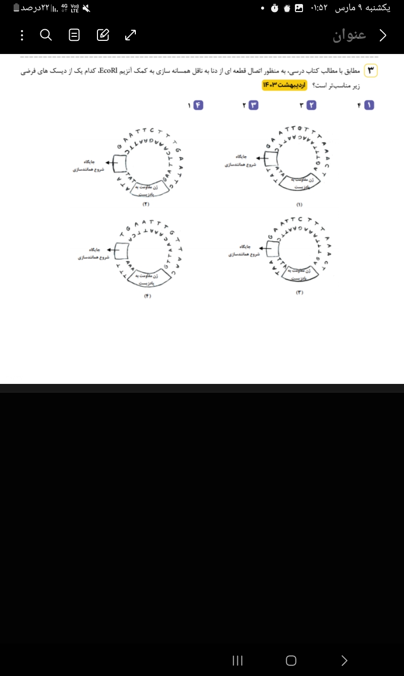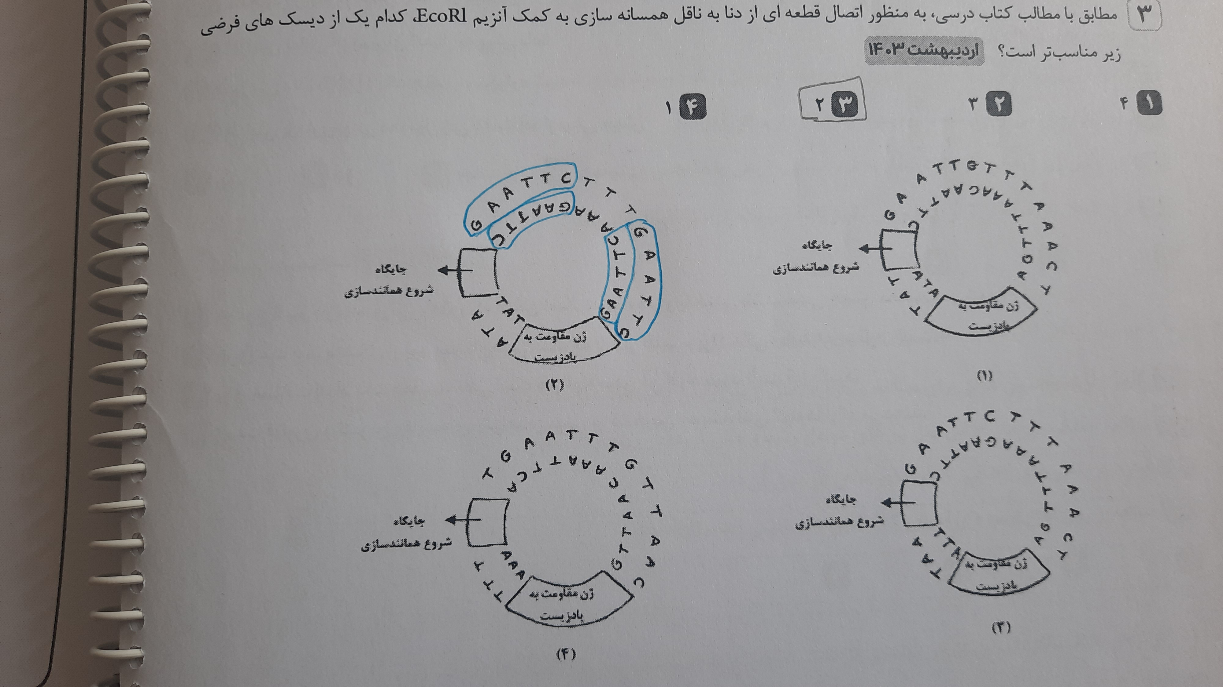 جواب میشه گزینه دوم بخاطر اینکه در ناقل همسانه سازی باید یک جایگاه تشخیص آنزیم EcoR1 باشه که تنها شکلی که این ویژگی رو داره شکل سومه