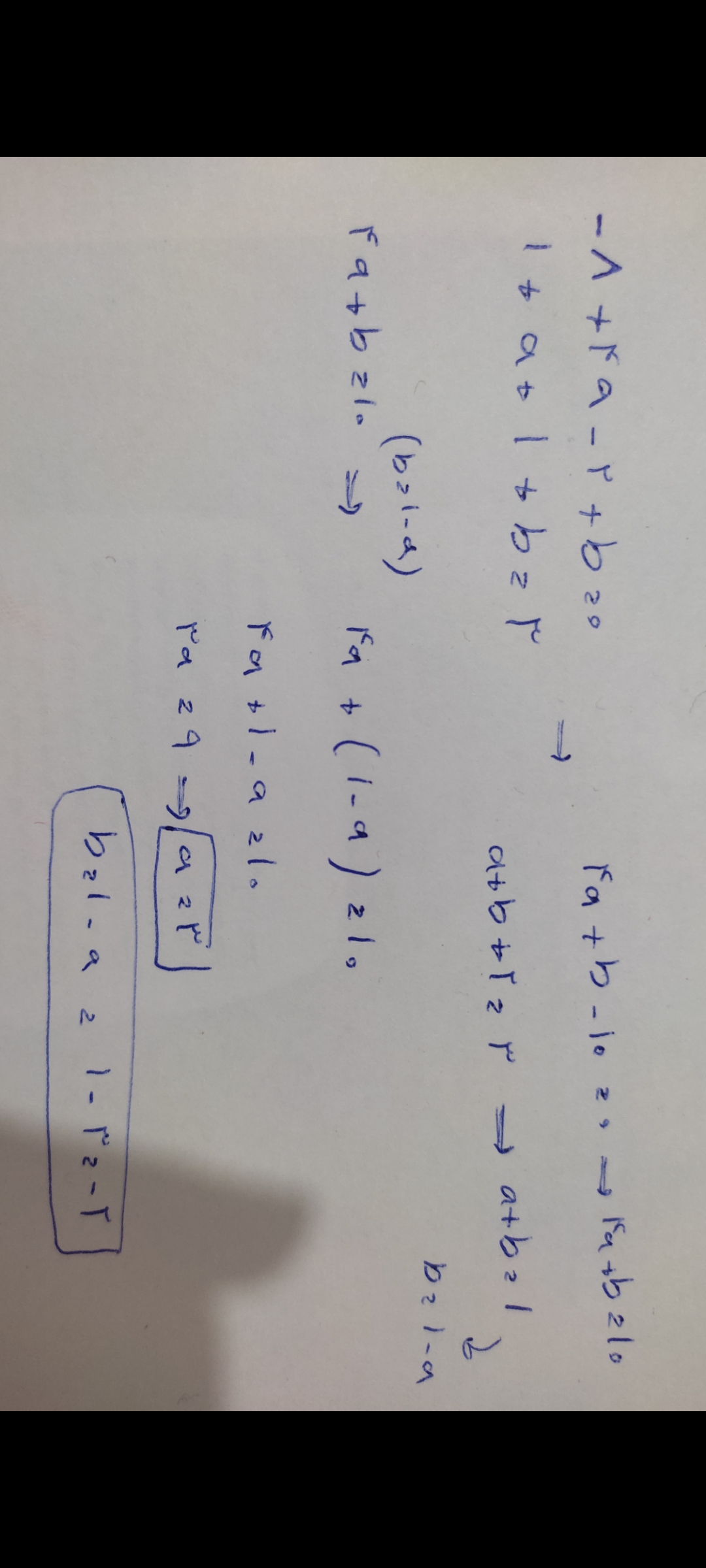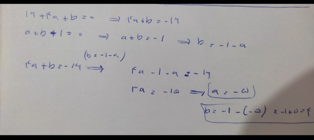 سلام تو دو خط اول معادله ها رو مرتب کردم جوری که متغیرها یک سمت و عدد سمت دیگه باشن حالا اومدم b رو بر حسب a بدست آوردم: b=1-a بعد تو معادله اول بجای b گذاشتم 1 منهای a که معادله یه مجهوله بشه حالت اینجوری a بدست اومد ۳ و b رو هم که برحسب اون بدست اوردم