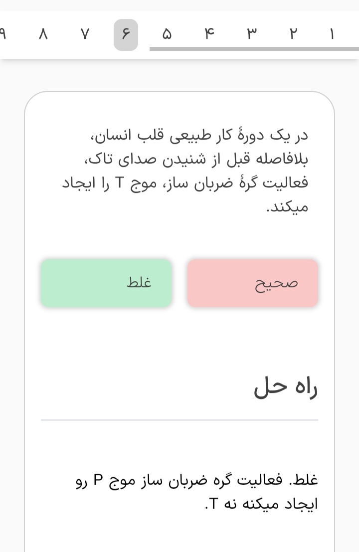 سلام در این سوال جواب غلط درسته که میگه قبل از شنیدن صدای تاک که صدای دوم قلب هست موج پی ایجاد میشه و جالب اینکه میگه بلافاصله و خب این به نظر غلط مییاد چون اگر روی نمودار نگاه کنید قبل از شنیدن صدای تاک موج تی ایجاد شده