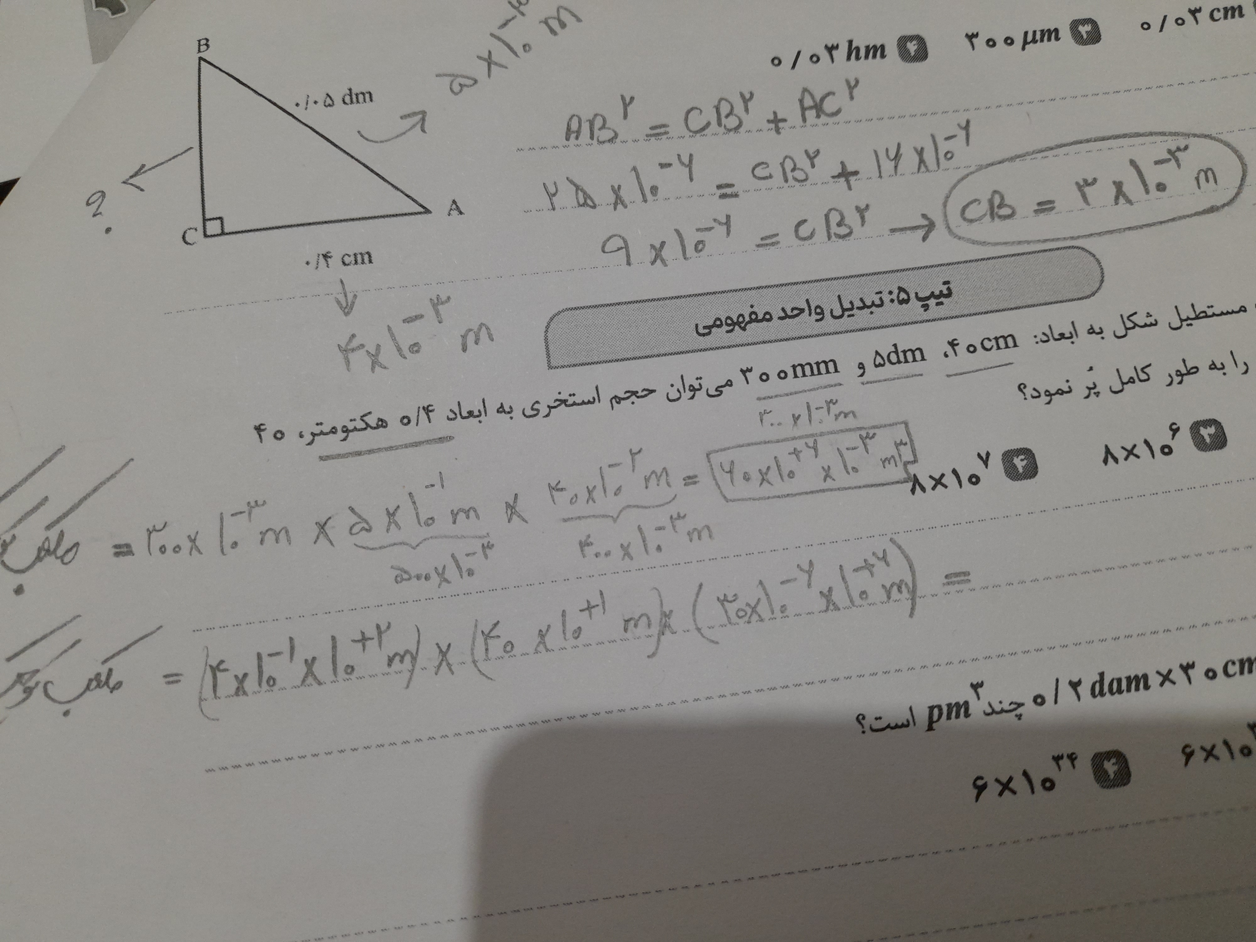 من اول تبدیل به متر کردم همه رو بعد توان هارا برار بر کردم که اگه با تبدیل های استاد مقایسه میکردم یکی بودن ولی جوابم اشتباه در اومد
