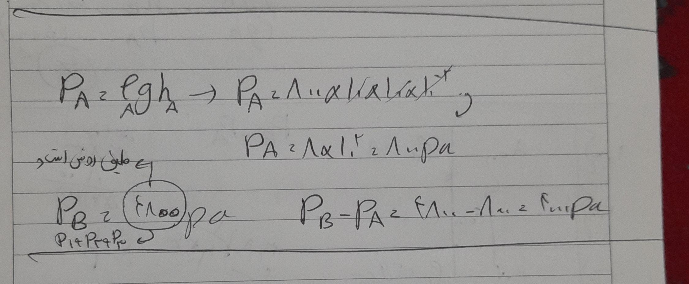 من اختلاف فشار رو متوجه نمیشم میشه توضیح بدید؟ نمیشد فشار قسمت A رو حساب کرد بعد B از هم کم کرد؟ تو این فرمول اختلاف که همه باهم جمع شدن