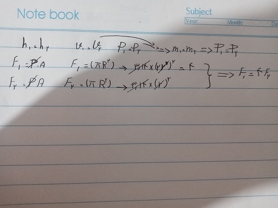 @سید محمد متین رشادی سلام فشار ظرف ها که از طریق رابطه pgh برابر بدست میاد ولی واسه نیرو من نسبت F هارو نوشتم ک میشه P*A P هارو ک گفتیم برابرن پس نسبت F1 به F2 رو باید برابر با A1 به A2 میشه و جوابش در اخر میشه 4 یعنی میتونیم بگیم F1 ، چهار برابر F2 هستش