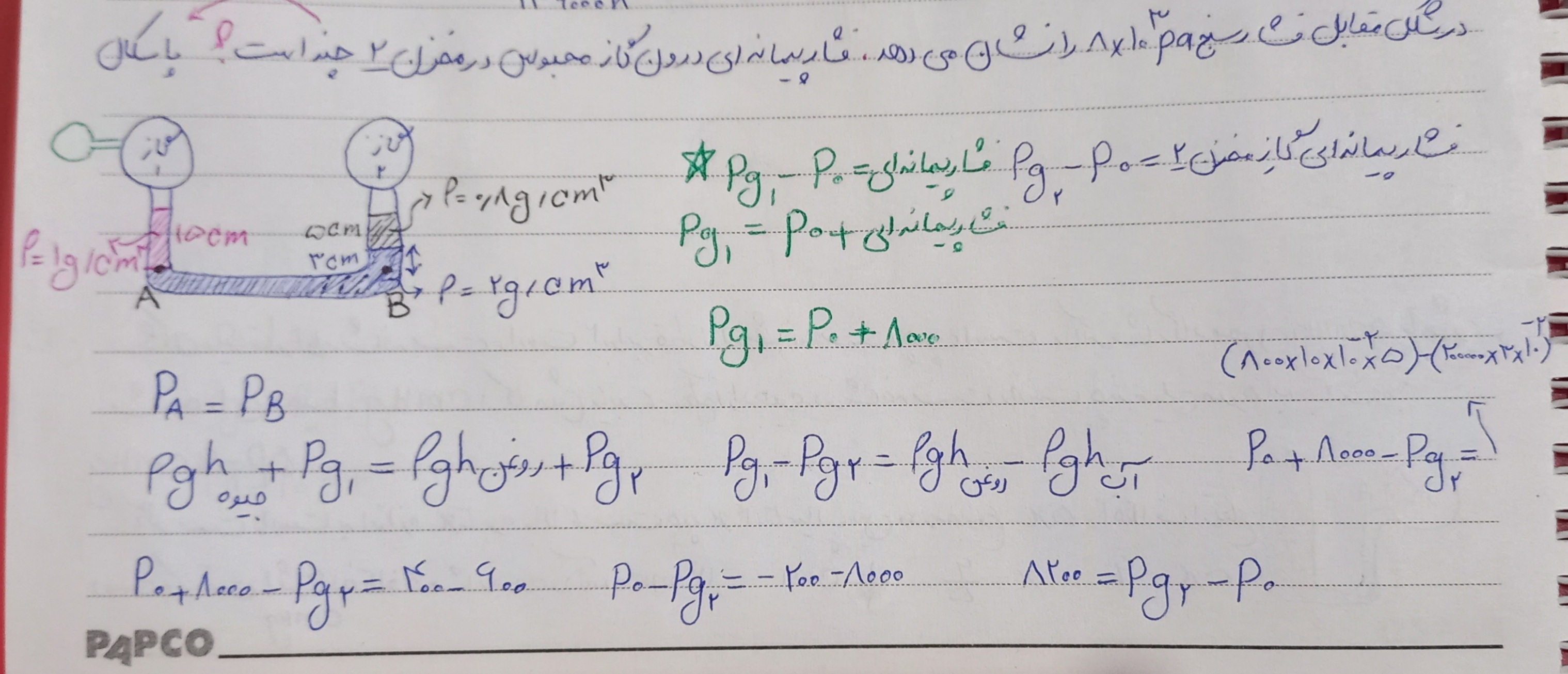 اگر pصفر رو حساب نکنیم چی؟! بگیم PA=PB بعد هر فشاری بالای سر هرکدوم میاد رو حساب کنیم، بدون در نظر گرفتن فشار هوا برای من شد 9500=1000+ pمخزن دوم فشار مخزن دوم شد ۸۵۰۰
