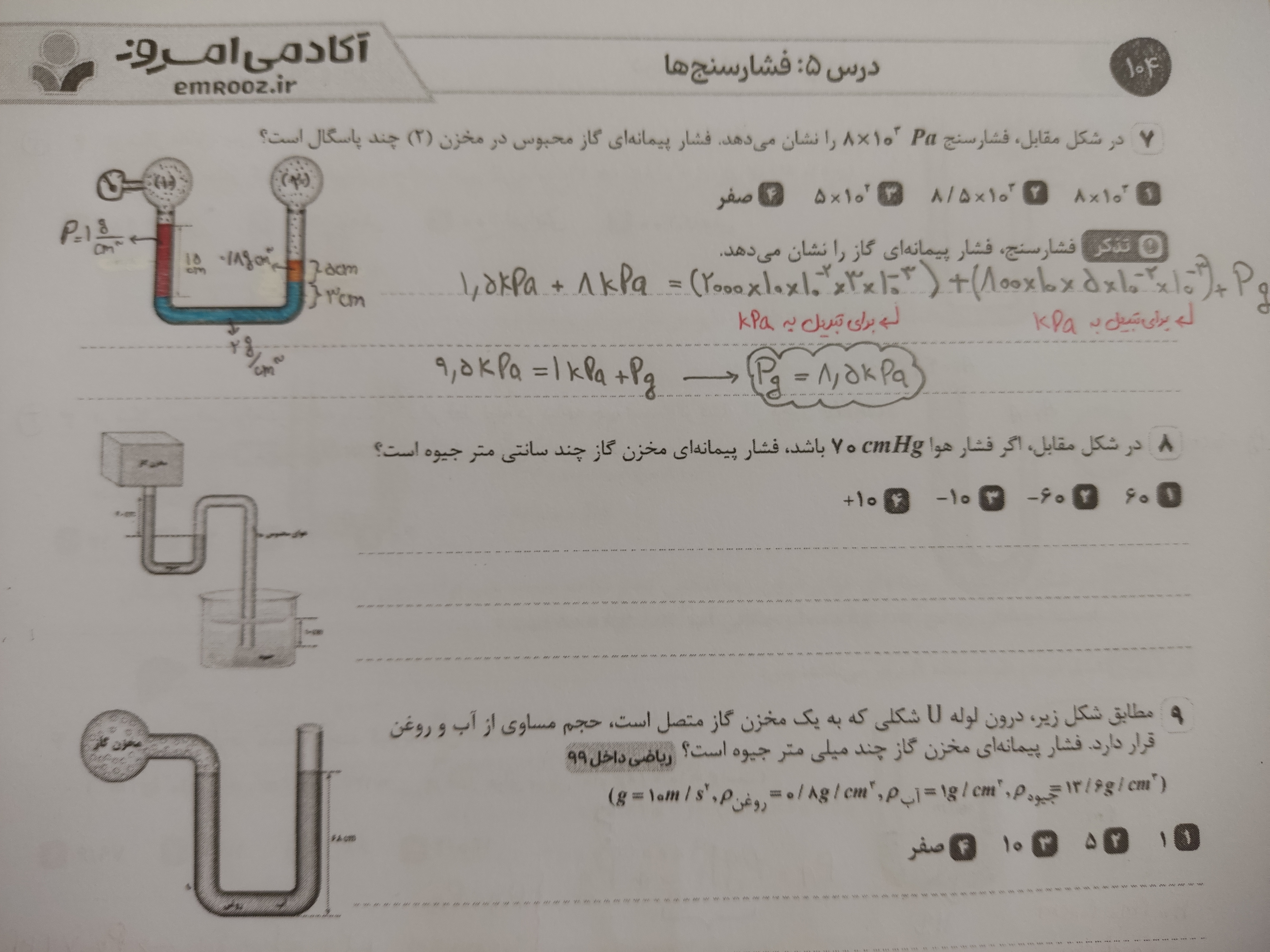سلام وقتتون بخیر ببخشید من این سوال رو اینجوری حل کردم درسته؟گفتم که طبق شکل چون ارتفاع مایع در ستون چپ بیشتره پس فشار گاز 2 از یک بیشتره و فقط گزینه دو از هشت هزار بیشتر میشه که زدم دو
