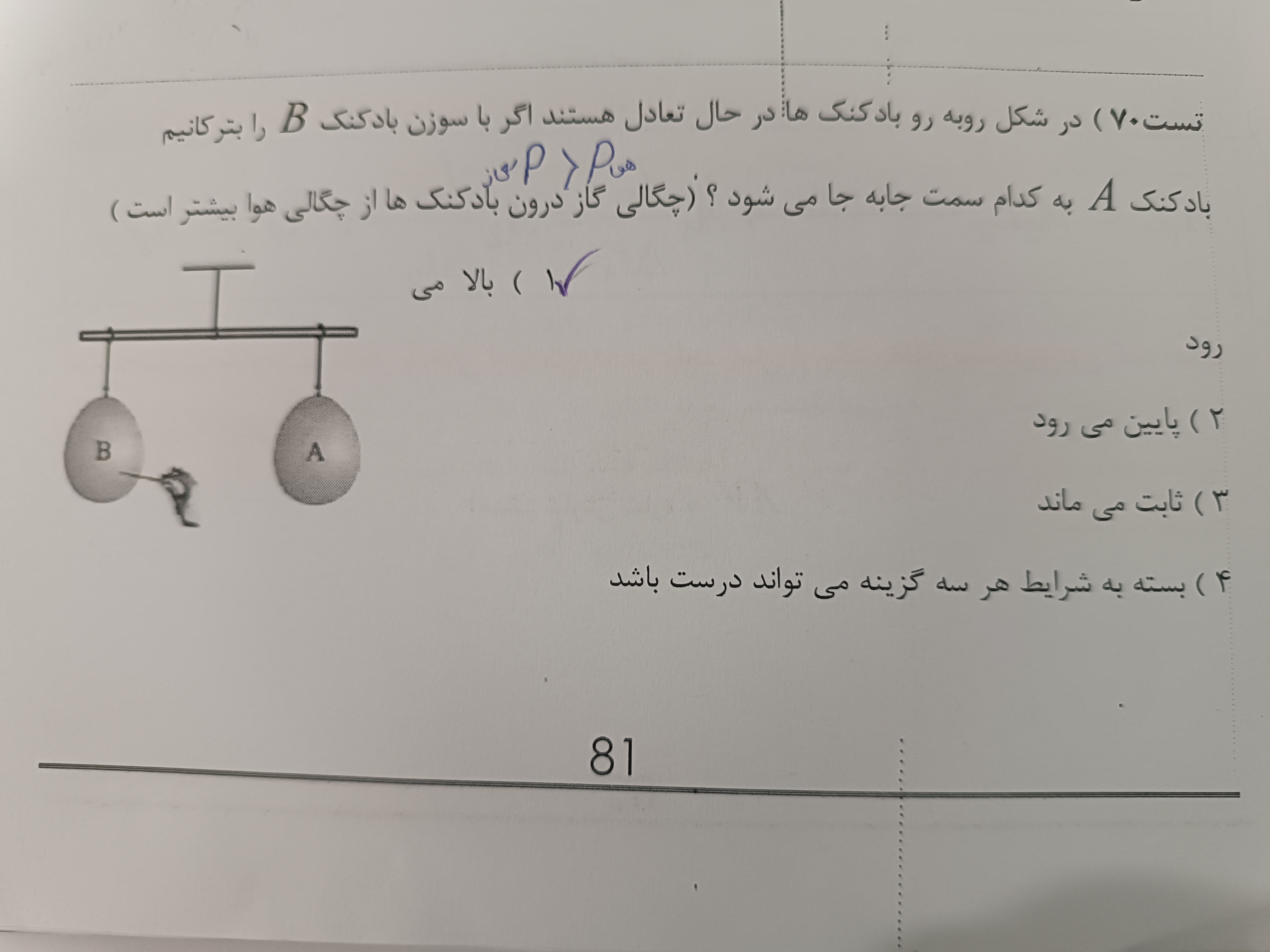سلام خسته نباشید باتوجه به صحبت های استاد میتونم نتیجه بگیرم که بین دو شاره ،هرچی چگالی بیشتر باشه می‌تونه وزن رو بالاتر نگه دارد و برعکس .... درسته ؟؟؟. اگر درسته این نتیجه رو برای این تست 👇👇به چه شکلی میتونم بگم ، چون دلیل بالا رفتن بادکنک Aرو متوجه نمیشم :؟)