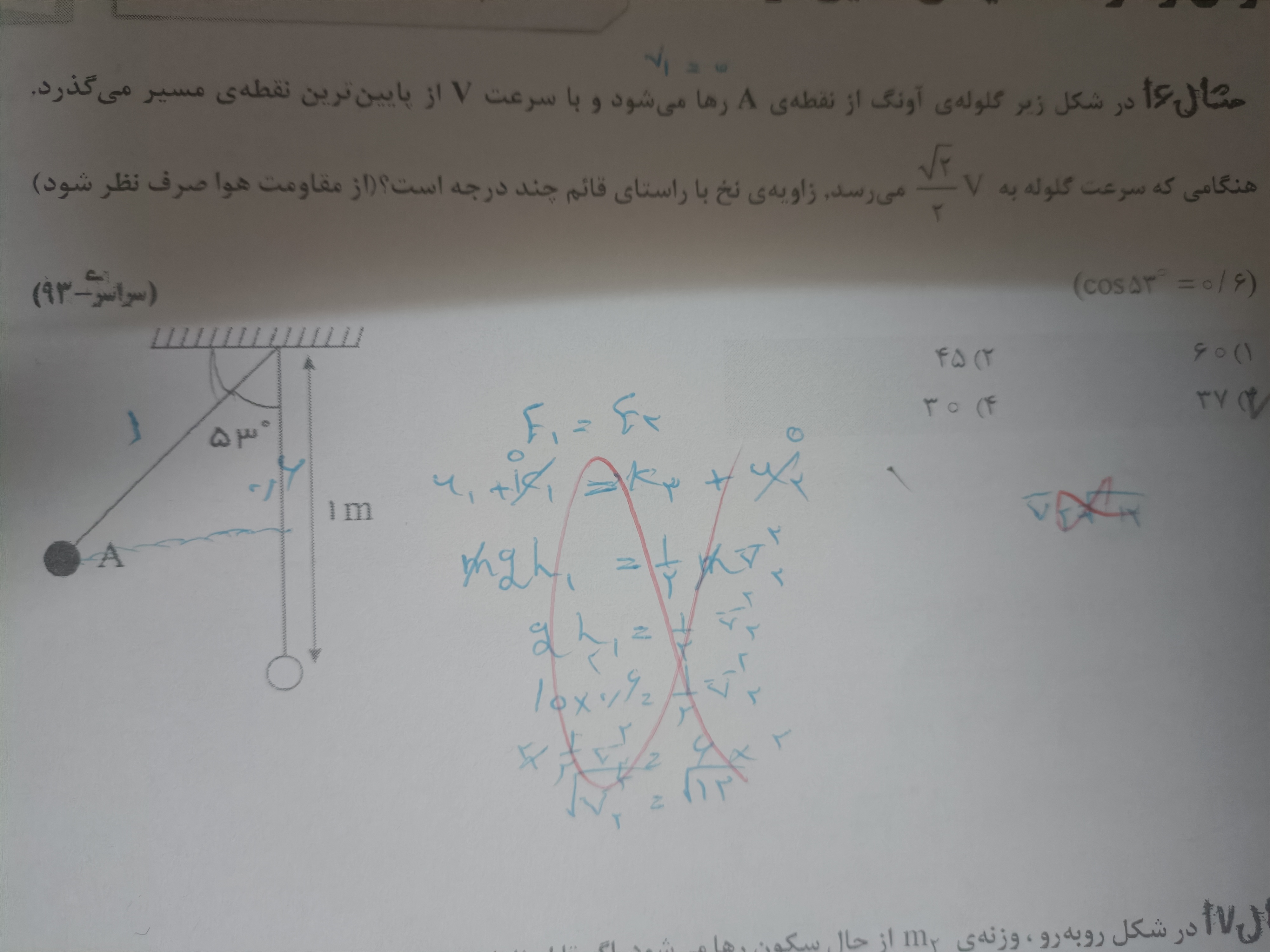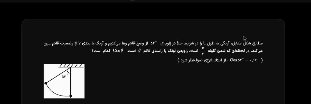 استدلالتون رو درک نکردم 🤔 زاویه نخ با راستای قائم رو داریم در نظر میگیریم که در لحظه آغاز،۵۳ هست در پایین ترین نقطه حرکت،این زاویه صفره و در پایان این زاویه چند میشه رو باید محاسبه کنیم چشمی نمیشه گفت