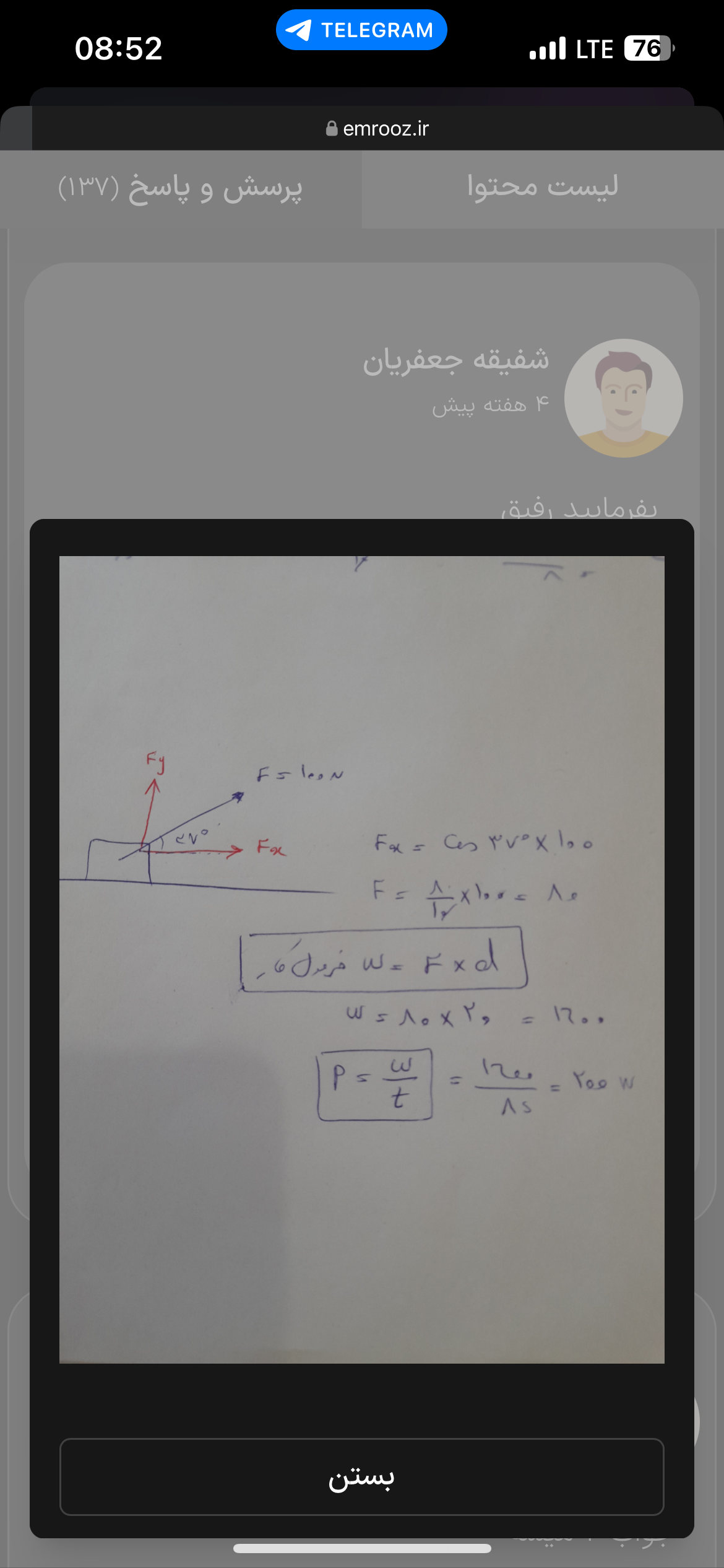 سلام برای اینکه توان این نیرو رو بدست بیاری باید اول مقدار‌کارش رو بدست بیاری و تقسیم بر زمان کنی به تصویر پایین توجه کن