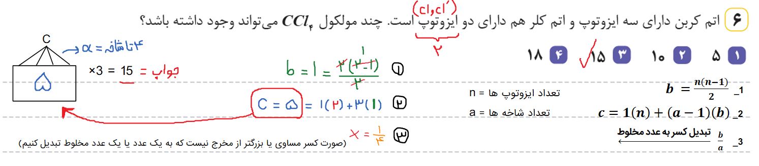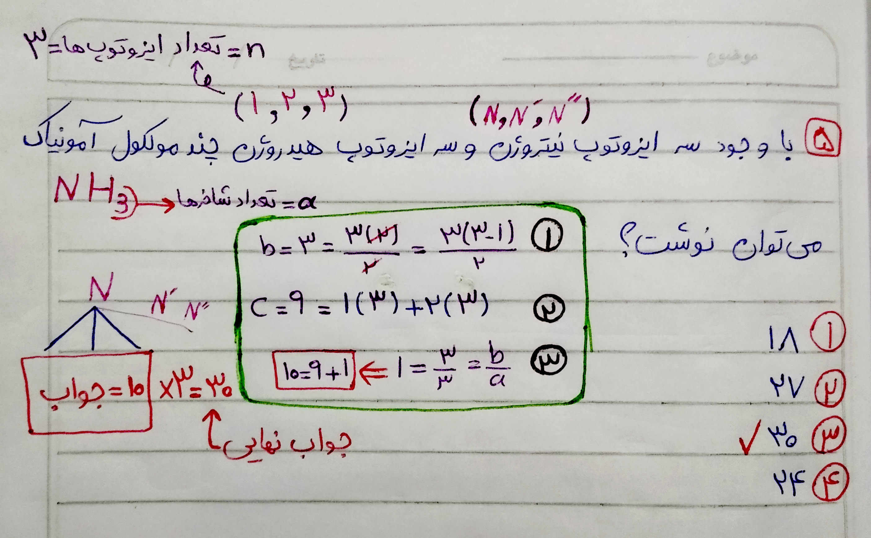 دوستان یه نکته خیلی مهم که من اونو جا انداختم و الان می‌خوام بهش اشاره کنم: ... اگه تعداد خط هاتون یا تعداد شاخه هاتون بزرگتر یا مساوی 3 بود اون موقع مرحله سوم رو انجام بدین. مثلا: در این سوال آمونیاک یا NH3 ، سه تا خط یا شاخه داره... پس حتما باید مرحله سوم فرمول رو انجام بدیم تا به تعداد مولکول درست برسیم یا مثلا در CCl4 حتما باید مرحله سه رو انجام بدیم چون چهار تا شاخه میشه کشید ولی در مولکول آب H2O ، کلا دو تا خط یا شاخه داره... پس نباید مرحله سوم رو بریم و فقط 2 تا مرحله اول رو بریم به تعداد مولکول درست میرسیم