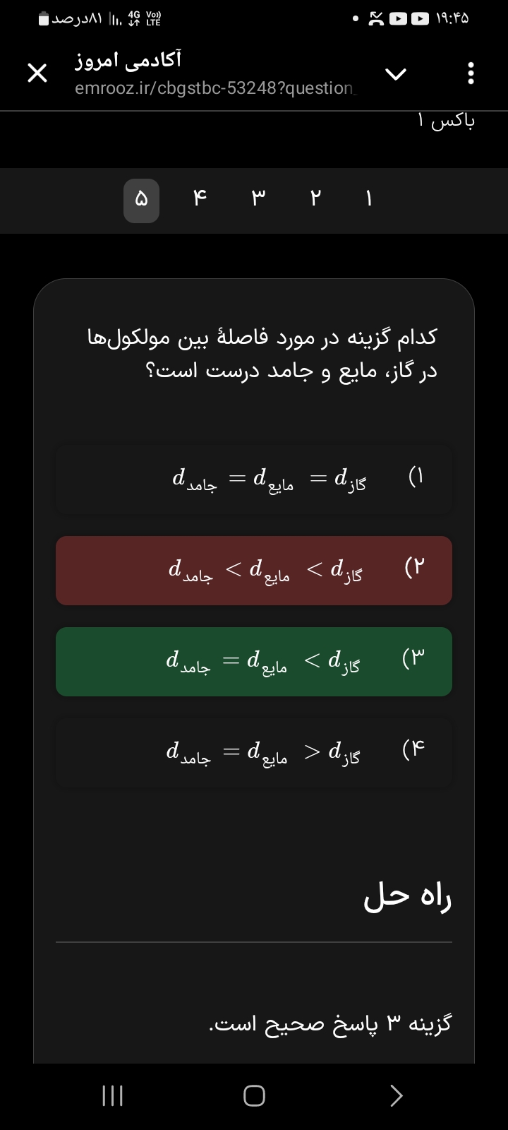 در این تست درباره نیروی مولکولی گاز مایع جامد درسته اگر به جزوه توجه کنی نیروی بین مولکولی جامدات ها بیشتر از مایعات و گاز ها بعدش مایعات بعد گاز ها بنابرین جامدات بیشتر از مایعات بیشتر از گاز ها در گزینه 2 این رو میبینیم توجه کن که اگر در مورد فاصله سوال میپرسید چنان چه در تست های چی یاد گرفتیم هم گرسیده انوقت میشه گفته شما یعنی مایعات جامدات برابر هم و کمتر از گاز ها