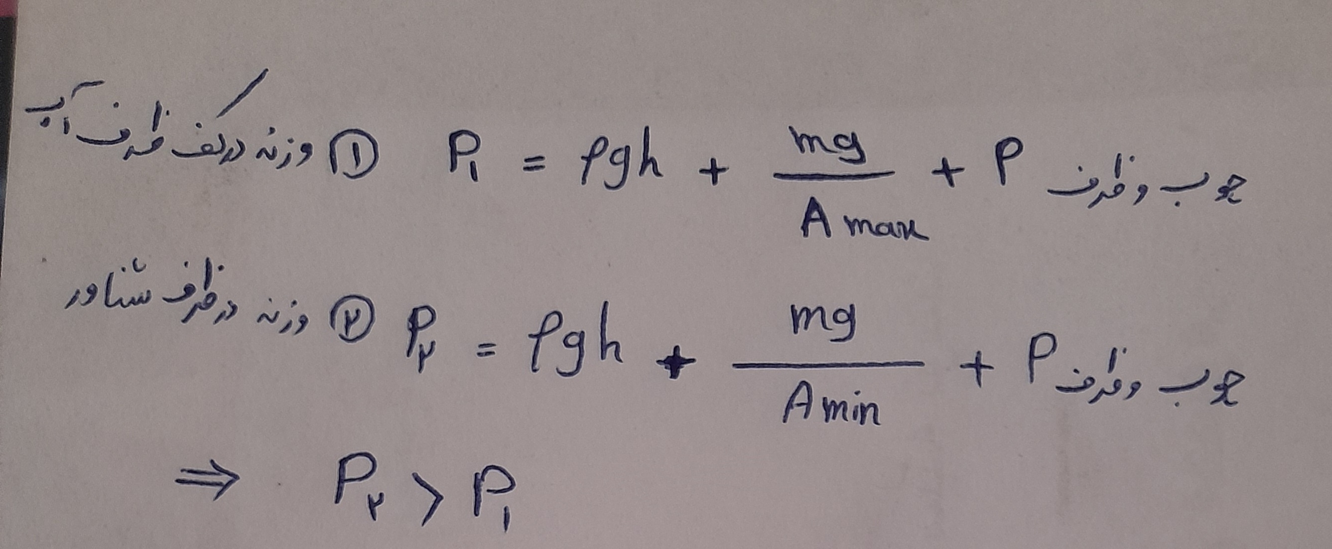 سلام وقت بخیر من قسمت اول سوالو نفهمیدم...مگه فشار به مساحت سطح مقطع بستگی نداشت و نمیگفتیم هرچی مساحت کمتر فشار بیشتر؟ از