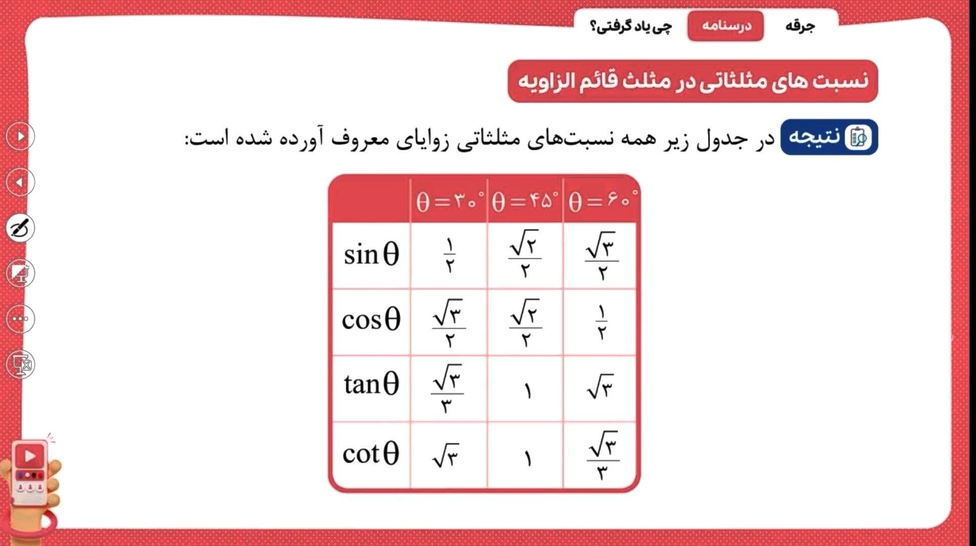 سلام و احترام در حل محاسبات این نسبت های مثلثاتی رو بلد باشید.. خارج از اون اگر نسبتی باشه صورت مسئله بهمون میده 🌿