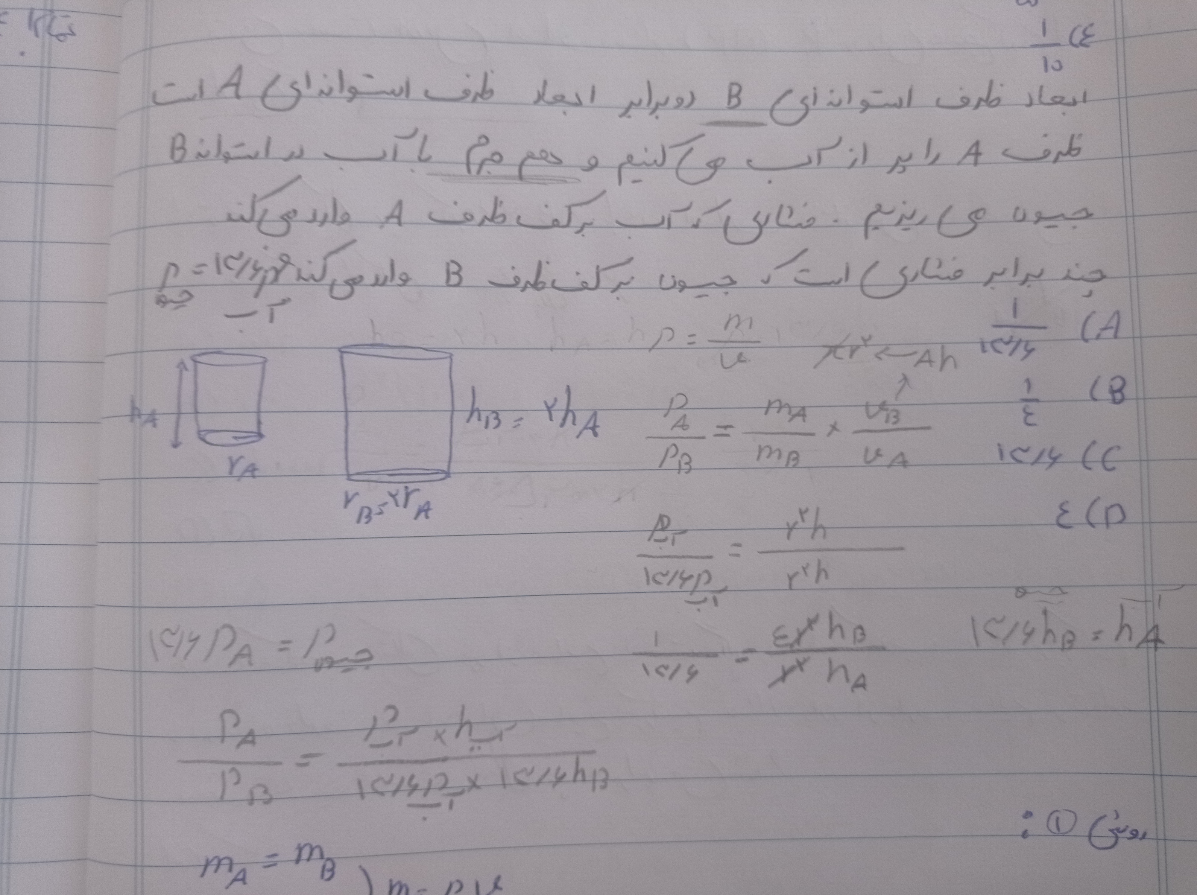 سلام فشار رو از رابطه چگالی در شتاب در ارتفاع مایع میخاد بدست بیاره برای همین میخاد محاسبه کنه اگر هم جرم باشن، ارتفاع هاشون چقدر میشه ارتفاع ها رو بدست میاره و تو رابطه قرار میده