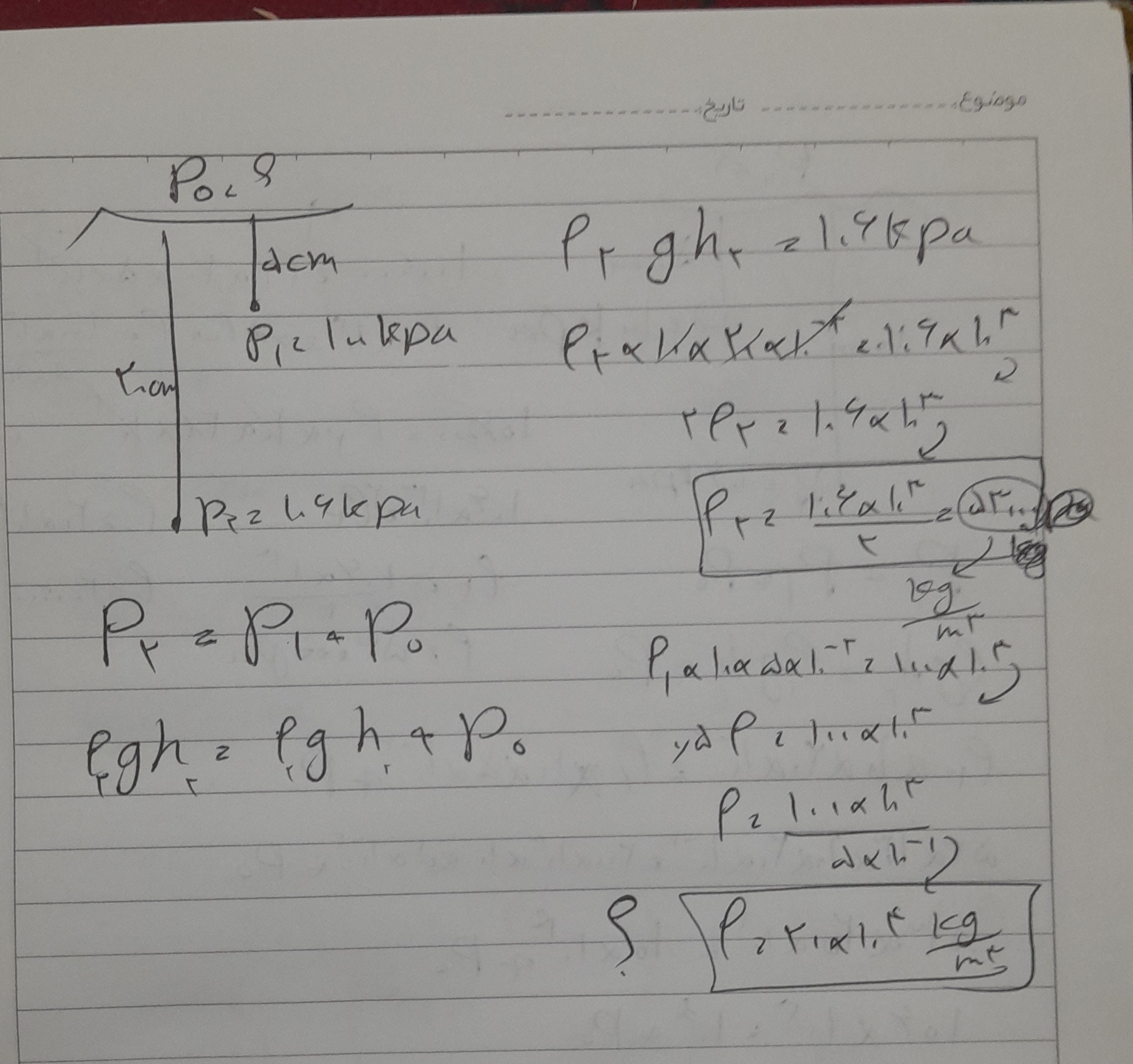 سلام من خواستم مثل سوال سوم این سوال هم حل کنم با خودم گفتم میام میگم فشار دوم برابر هست با جمع فشار اول و فشار هوا و از طریق جایگذاری به فشار هوا میرسم از یه طرف گفتم چون چگالی هارو ندارم و با توجه به اینکه فشار هر دو نقطه رو به من داده پس میتونم از طریق جایگذاری چگالی رو به دست بیاریم اما چیزی که عجیبه و نمیفهمم این هست که در ارتفاع ۵ سانتی متری و ۲۰ سانتی متری من دو چگالی با مقدار متفاوت به دست آوردم که این نمیشه و غلطه تا بخوام داخل فرمول بزارم مشکل کجاست ؟؟
