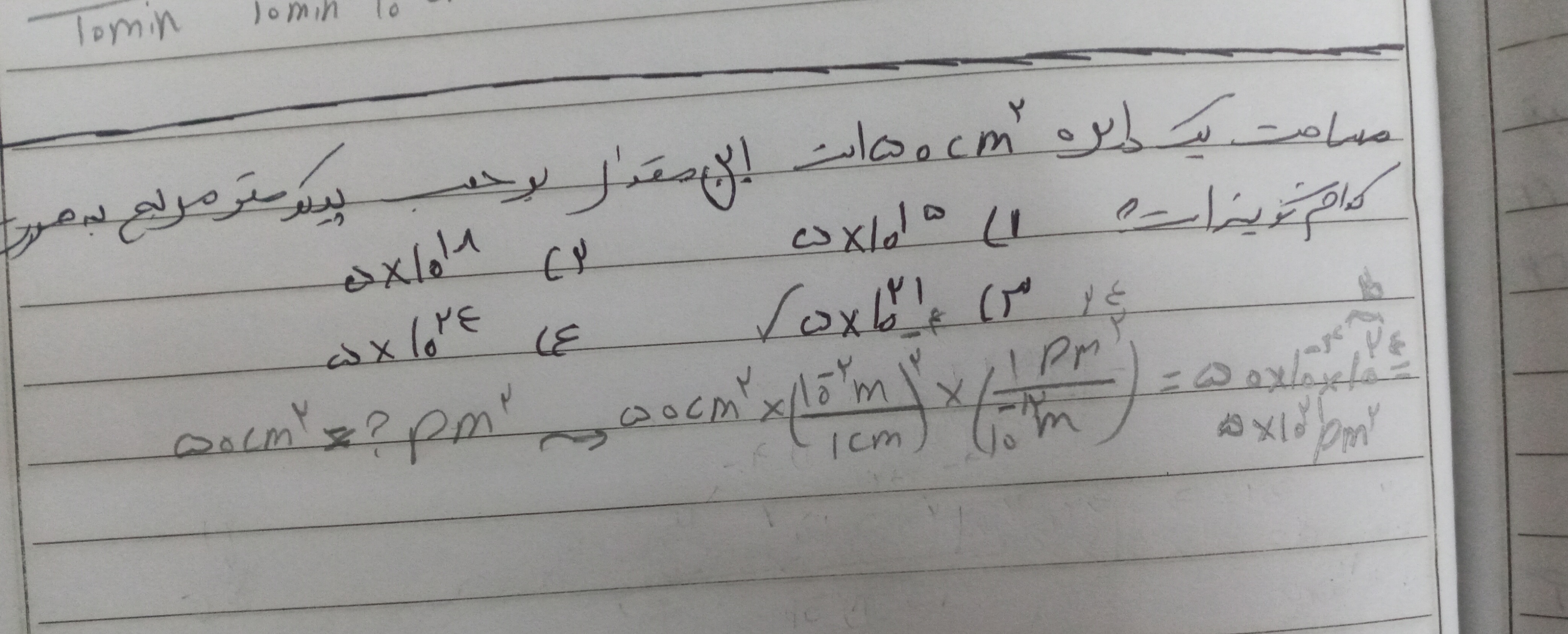 میشه این سوال آخر رو برام توضیح بدین مساحت دایره ۵۰cmمربع است مساحت آن را بر حسب پیکومتر به دست اورید؟