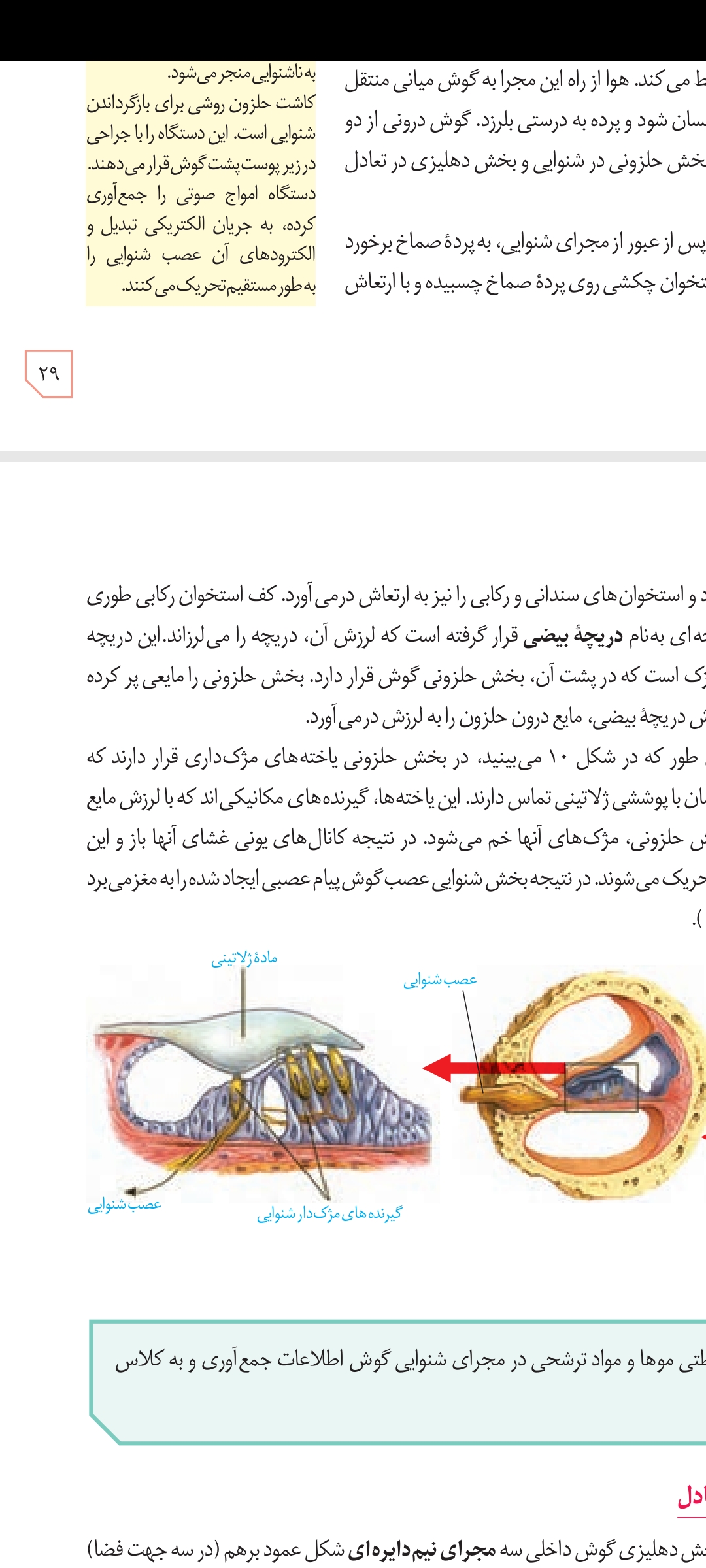 سلام و عرض ادب. احوال شریف. یک موضوع کلی و تحلیل کلی میخواستم بگم در رابطه با این گزینه 2. که امیدوارم درست باشه . اول اینکه ما میدانیم که (( بخش حلزونی گوش)). کلا از بیرون استخوانی ( استخوان جمجمه ) است و حتی با برش عرضی .هم لوله حلزون بافت استخوانی زیادی دارد که با شکل کتاب هم میشه بهش توجه کرد. ولی اینجا بنظرم میشه به این (( گزینه 2)) گیر داد که دید طراح در این گزینه 2. یاخته های پوششی هستن. ولی اگر با دقت بیشتری به شکل کتاب و متن جزوه نگاه کنیم. گفته شده که در (( ناحیه ای که گیرنده ای شنوایی وجود دارند در مجرای وسطی حلزون. یاخته های پوششی اطراف آنها فراوان ترند.)). بنظر من گر طراح بجای این جمله. می گفت: (( فراوان ترین یاخته های مجرای استخوانی وسطی حلزون گوش یا در محل گیرنده های شنوایی. بافت پوششی می باشند )) درست بود. نظر شما چیست؟؟؟؟؟