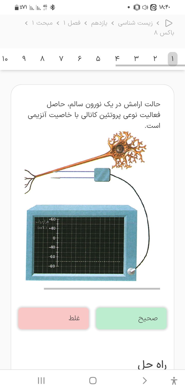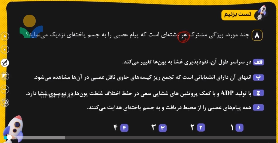 سلام، وقت به خیر دوستان دیگری هم قبلا در این مورد صحبت کرده اند، 2 موضوع شاید کمک کنه: 1- برای بهتر متوجه شدن این گزینه و تست، لطفا تست شماره 8 همین درس را ببینید. (عکسش را فرستادم.) 2- گزینه ب را میشه این طور بیان کرد؛ به هر حال طی پتانسیل عمل، یونهای مجاور ناحیه داخلی سیتوپلاسم به طور موقت مثبت می شوند، تا بتونند نقاط بعدی داخل سیتوپلاسم را تحریک کنند و به قول استاد موج مکزیکی را به جلو هدایت کنند، ولی نمی تونیم مثبت شدن موقت این ناحیه (مجاور داخل غشای سیتوپلاسم) را با بیرون سیتوپلاسم مقایسه کنیم!! چون بیرون سیتوپلاسم بلافاصله بعد از غشا، یاخته عایق کننده میلین هست و بعد از اون به ناحیه دورتری از مایع بین یاخته ای می رسیم که ما در مورد میزان حضور یونها در اون منطقه اطلاعی نداریم، ما طی پتانسیل عمل و آرامش، فقط می تونیم، غلظت یونها در دو ناحیه مجاور غشا در سیتو پلاسم را با هم مقایسه کنیم.