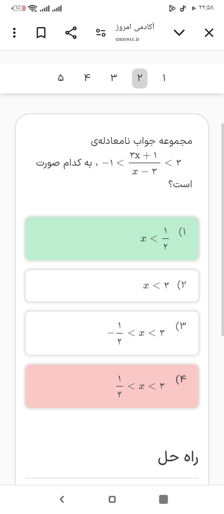 من با روش فرمول به همین جواب استاد می رسم ولی با رسم تابع چچن مجانب افقی y=2 هست همواره نمودار پایین تر از ۳ هست و جواب میشه x های بزرگتر از ۴ یعنی گزینه ۳