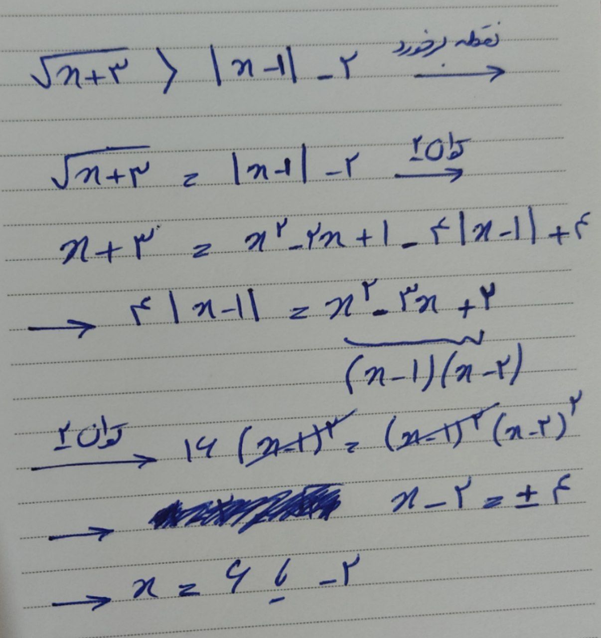 @نرگس رحیمی ممنون من همین کار رو کردم و جوابم درست شد.ولی فقط من اول X های بزرگتر از یک رو حساب کردم و بعد X های بین منفی سه و عدد یک رو حساب کردم.مشکلی نداره؟ ببخشید یک سوال دیگه هم داشتم.مثلا اینجا اگه به جای رادیکال ایکس + سه اصلا رادیکال نبود و خود سه + ایکس بود فقط باید براساس ریشه قدر مطلق حساب میکردم؟