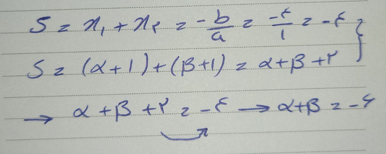 سلام و درود آلفا به علاوه یک و بتا به علاوه ریشه های ما هستن که حاصل جمعشون از قرینه نسبت ضریب ایکس به ضریب ایکس به توان دو بدست میاد حالا اگر جمع رو انجام بدیم و مقادیر رو جایگذاری کنیم، میبینیم الفا به علاوه بتا به علاوه دو مساوی میشه با منفی ۴ دو رو میاریم سمت دیگه و منفی میشه با منفی چهار میشن منفی شش