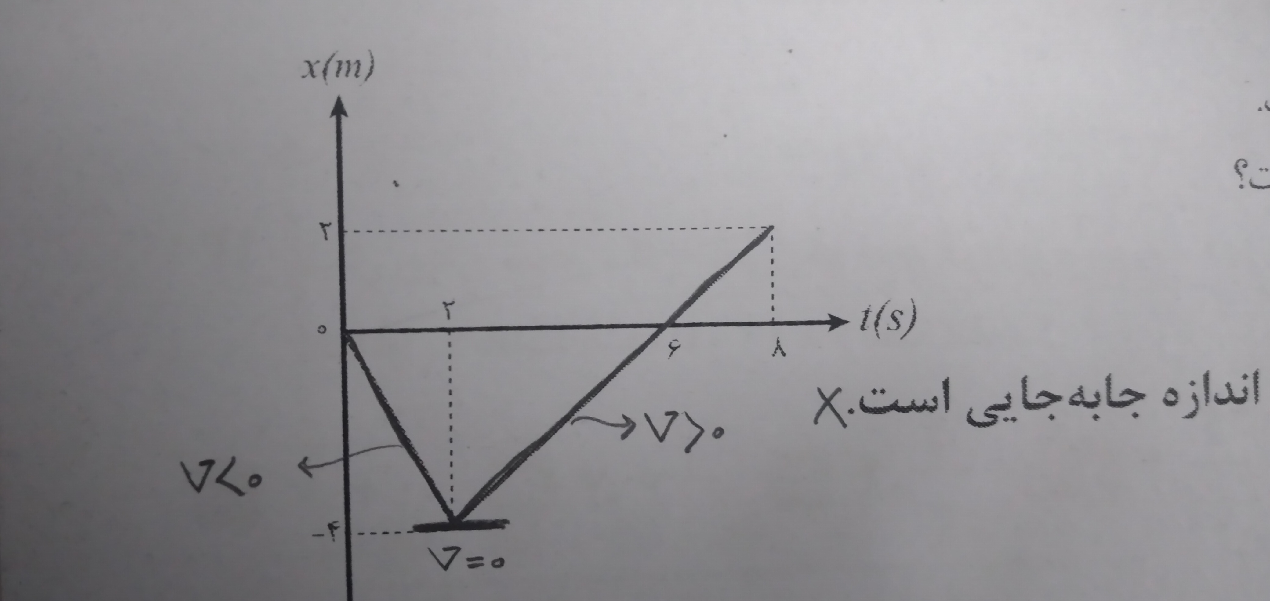 سلام وقتی در بازه ۰ تا ۲ سرعت منفیه و در بازه ۲ تا ۸ سرعت مثبته،یعنی در لحظه t=2s سرعت صفره؟