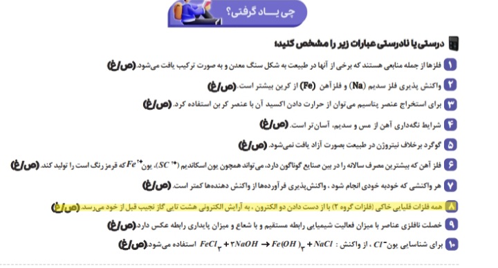 سلام ببخشید سوال ۹ فقط درمورد نافلزات صدق میکنه! نه در مورد فلز! در صورتی که صورت سوال گفته عناصر میشه توضیح بدید اینو