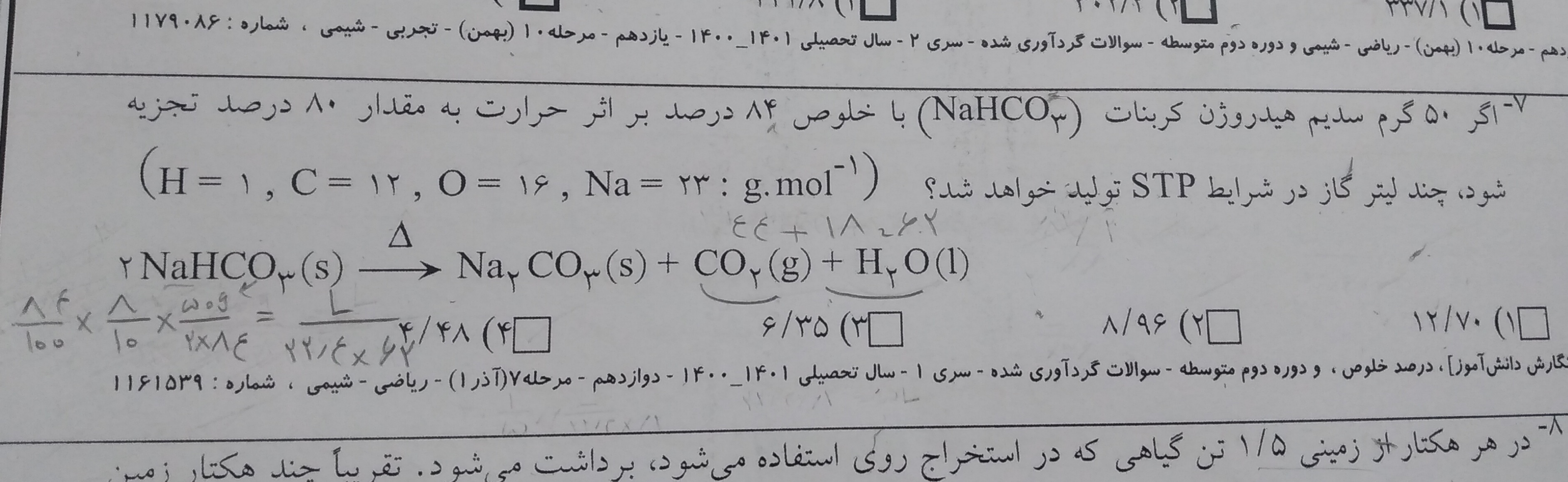 سلام وقت بخیر اگر یک ترکیب به ما داد و بازده یا درصد خلوص رو هم داد اگر خود سوال گفته باشه این بازده یا درصد خلوص مربوط به ترکیب است ضرب میکنیم ولی اگه گفته باشه مثلا بازده یا درصد خلوص مربوط به فراورده است باید در کسر سمت چپ ضرب کنیم درسته؟