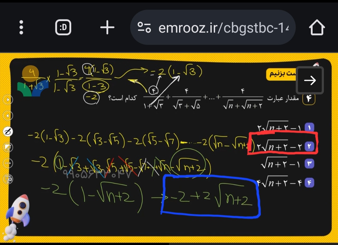 @سجاد اسماعیلی من اولی و دومی رو گویا کردم و جمع کردم شد 2ضربدر رادیکال5 منهای 2 که با مقایسه با n که در عبارت اول 3 هست میشه فهمید زیر رادیکال میشه 2+n