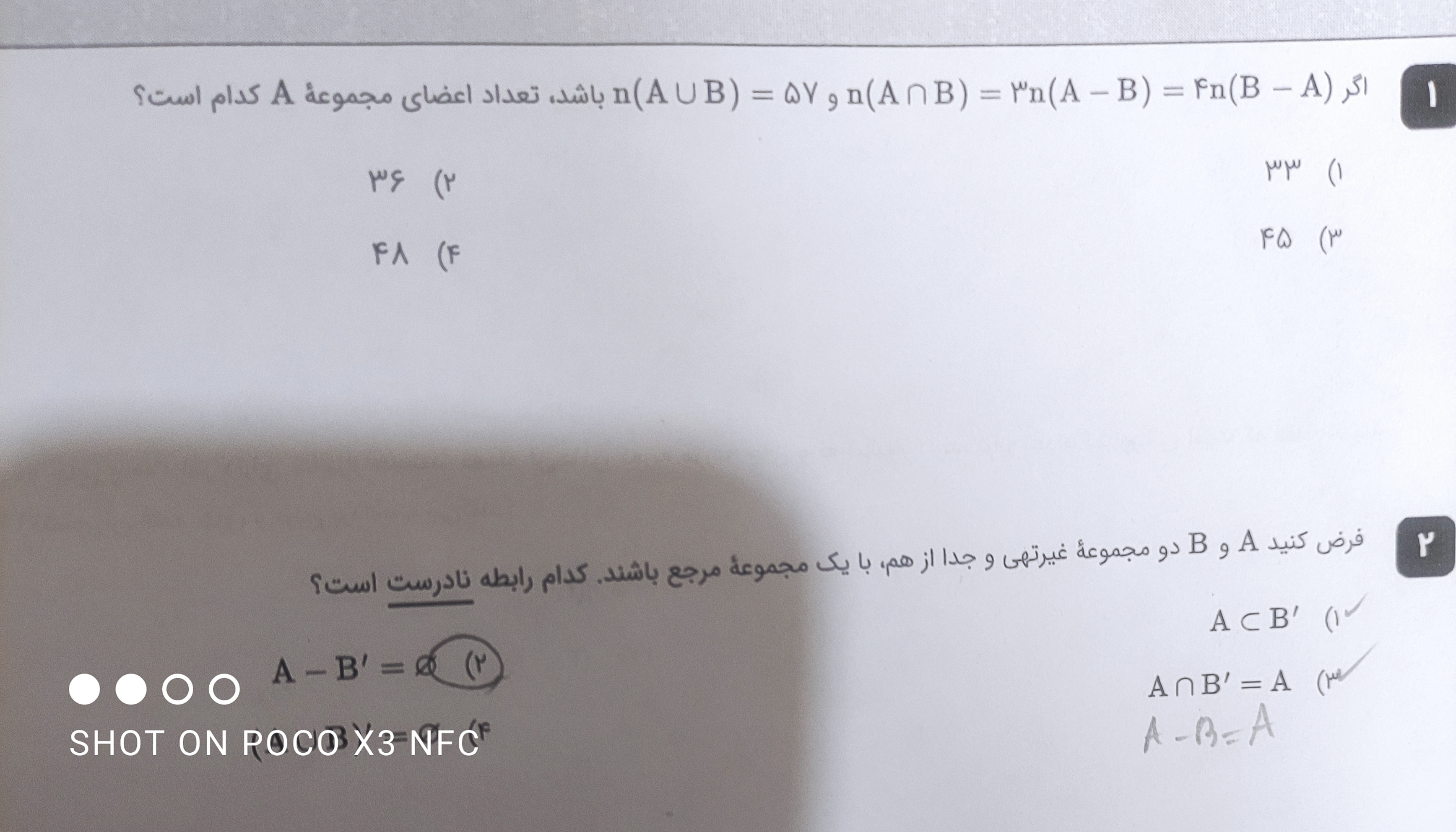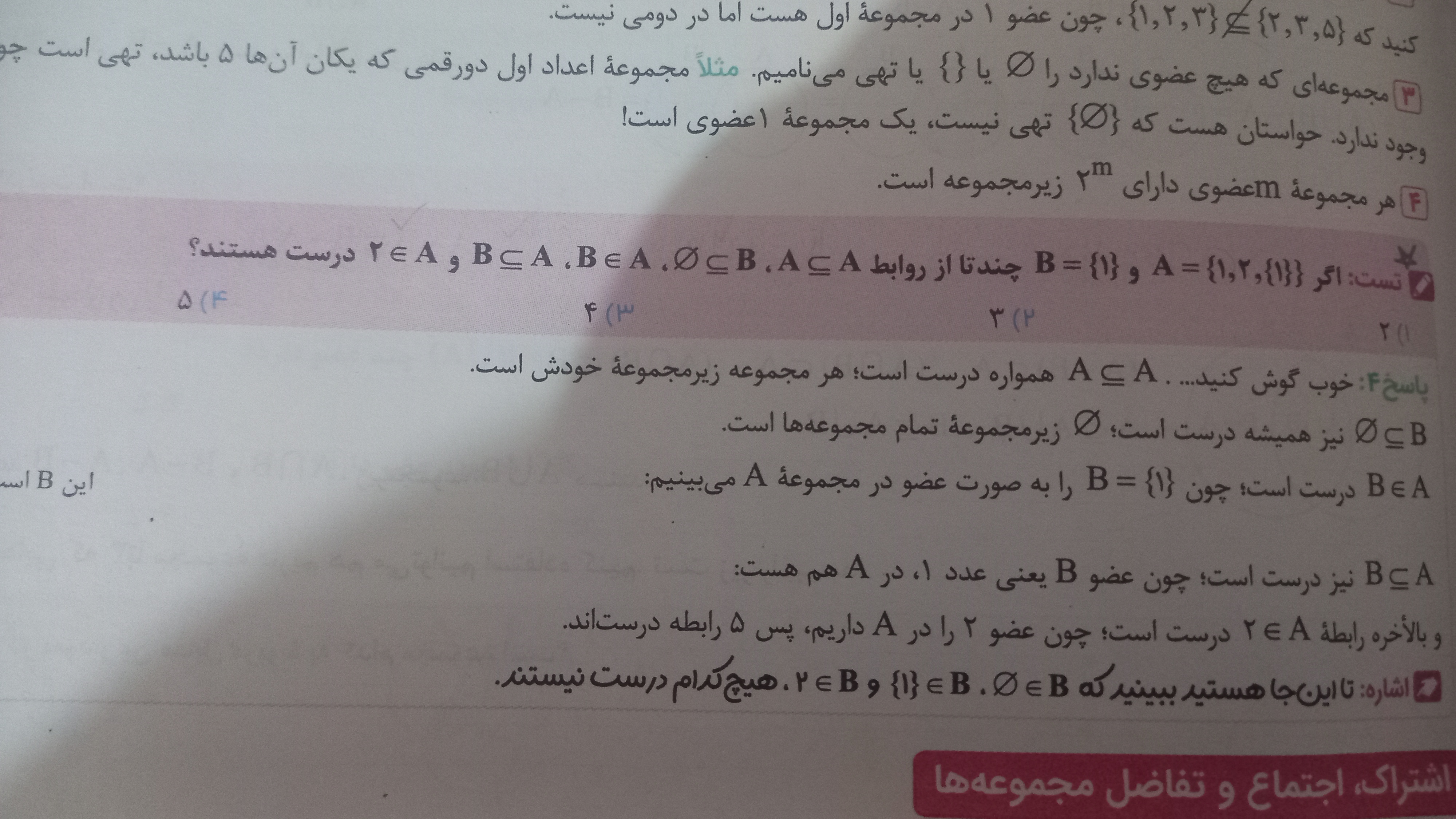 سلام پاسخ چی یادگرفتی U_A که در مرجع ۹ عضوهست و در مجموعه A ۴ عضو مشترکان بینشون ۲،۳،۵،۷ هست پس پنج عضو باقی مونده میشه جواب؟