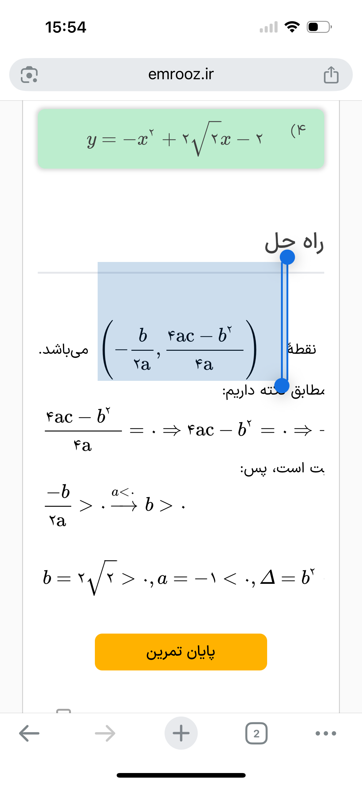 @سید محمد متین رشادی سلام؛بله سوال درمورد نمودار سهمی هست ولی تو فرمولی ک استاد حین تدریس گفتن مخرج 2a بود ولی اینجا چرا مخرج گفته شده ۴a من تموم حرفم اینه چهار از کجا اومد؟ اینو متوجه نمیشم بله کل سوالو برانوم میفرستم
