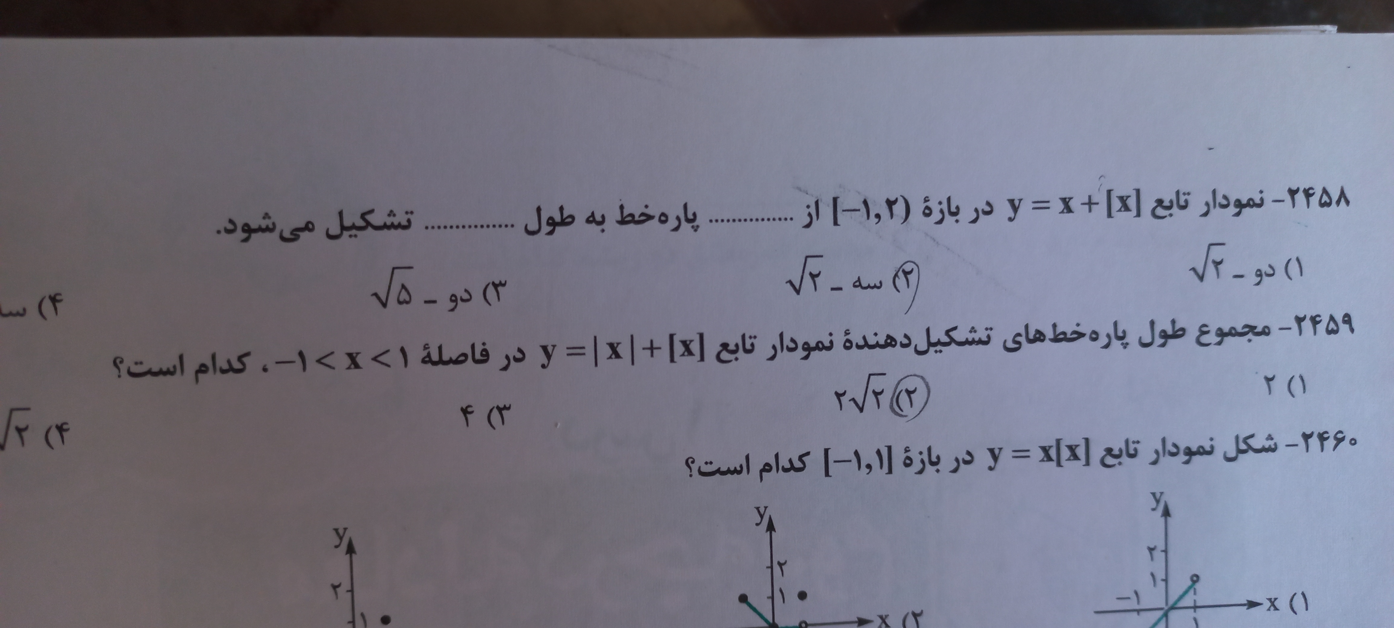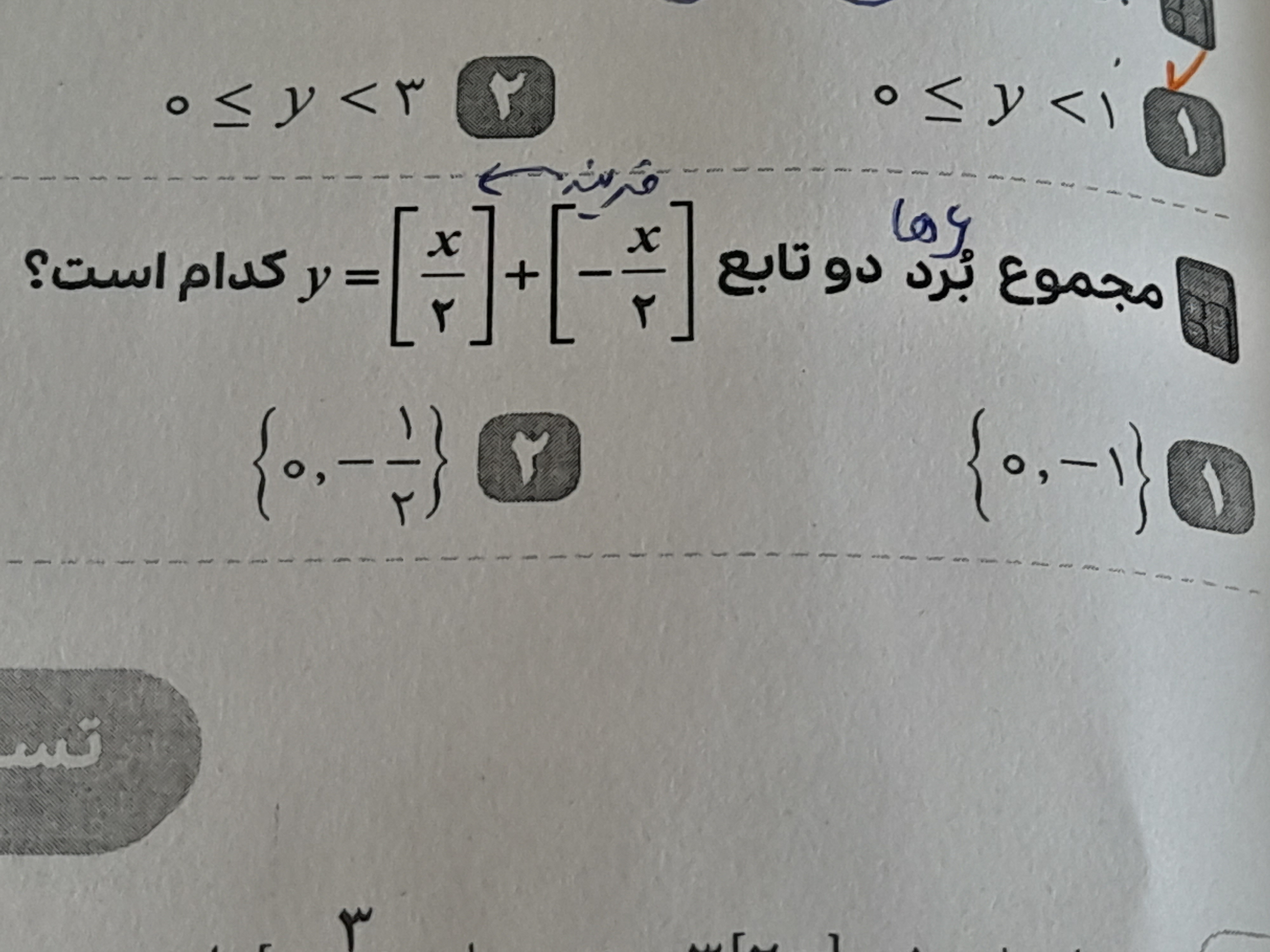 @الناز زارع ؛) وقتی داخل براکت رو بین دو عدد صحیح قرار میدیم ، جز صحیح اون میشه عدد کمتره ! اینجا دو ایکس رو بین دو و سه قرار دادیم ، یعنی هر عدد بین دو و سه ، جز صحیحش دو هست ! پس جواب داخل براکت که بین دو و سه قرار گرفته هم میشه دو . حالا دو رو ضربدر 3 میکنیم و بعد منهای یک که جواب آخر تابع میشه 5 !