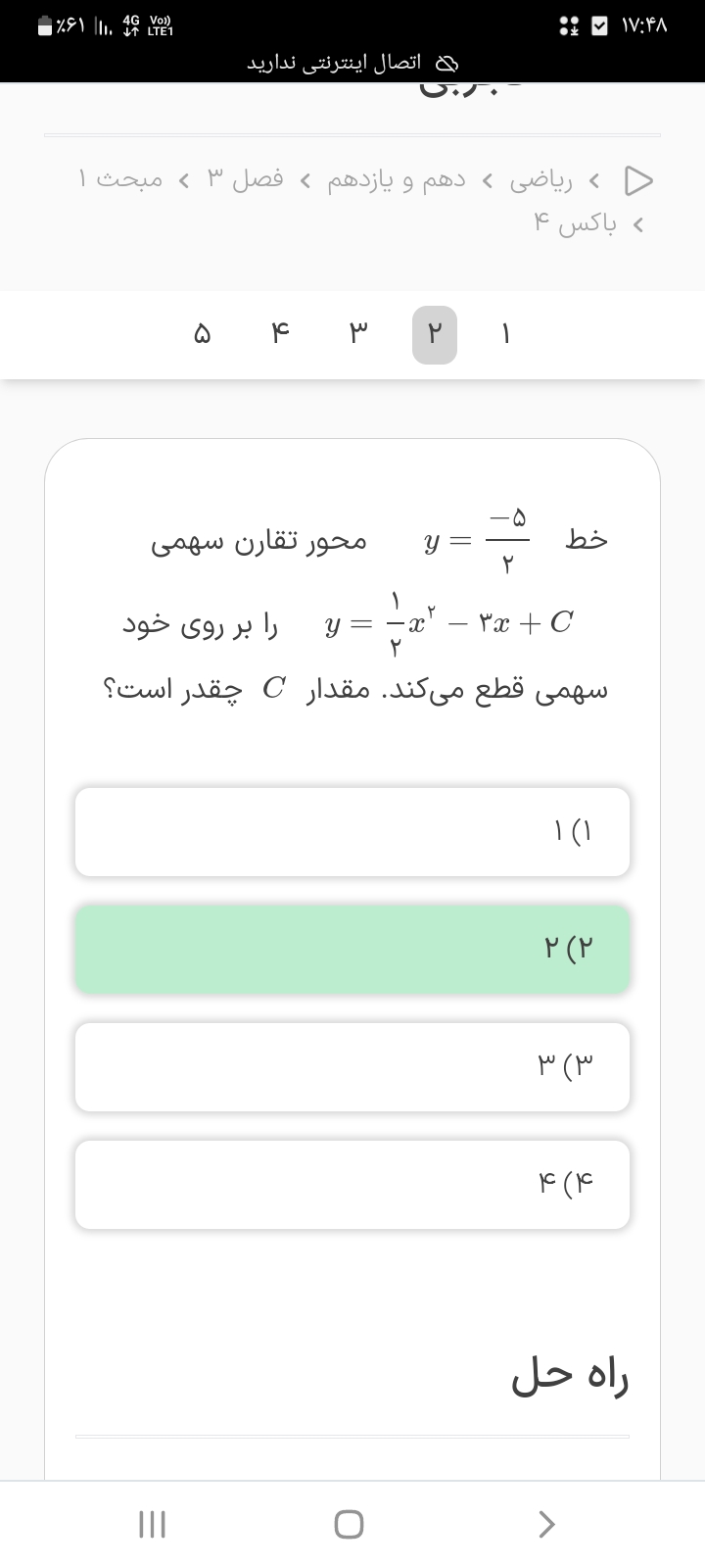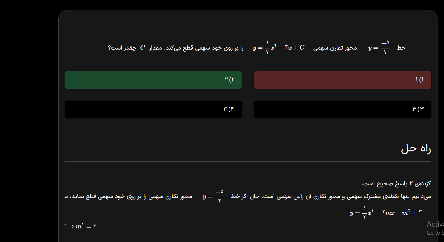سلام وقت شما بخیر وقتی یه خطی موازی محور x ها سهمی رو تو یه نقطه روی اون قطع میکنه یعنی عرض راس اون سهمی با عرض اون خط برابرن حالا عرض راس سهمی برابر منفی دلتا برروی 4a هستش کافیه اینو برابر -۵/۲ بزارید