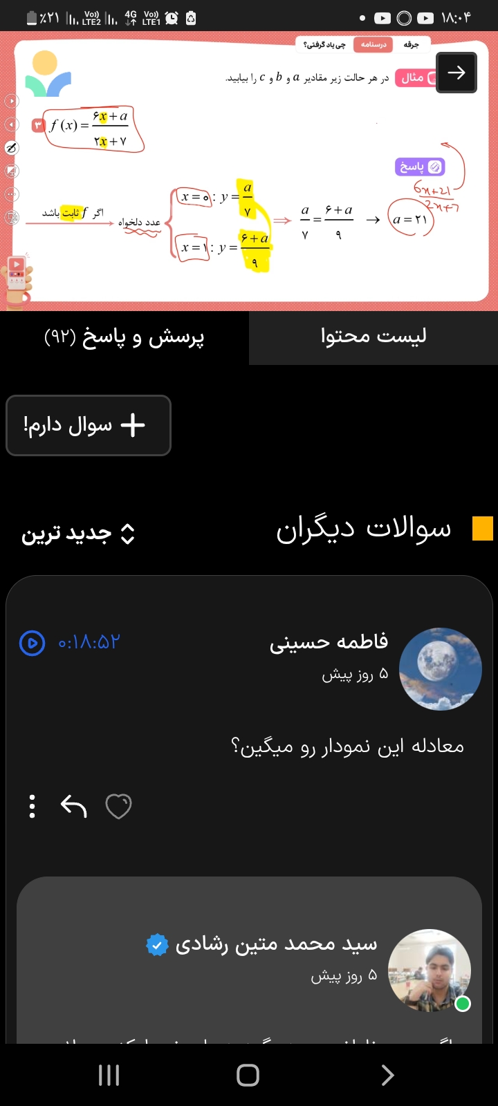 سلام خدمت شما فرقی نمی کنه ، اگر می خوای برای خودت اثباتش کنی به جای اینکه 2، 3برابر بشه 5 برابرش کن که میشه به این صورت 10x+a بر روی 7+2x طبق چیزی که دبیر گفتن انجام بدیم a=35 بعد برای کسر جدید فاکتور می گیریم که به 5 میشه و فاکتورش میشه (7+2x)5 حالا به مخرج که 7+2x هست پرانتز خط می خوره و فقط 5 باقی می مونه در صورت کسر و تابع ثابت به صورت 5=f(x) میشه.