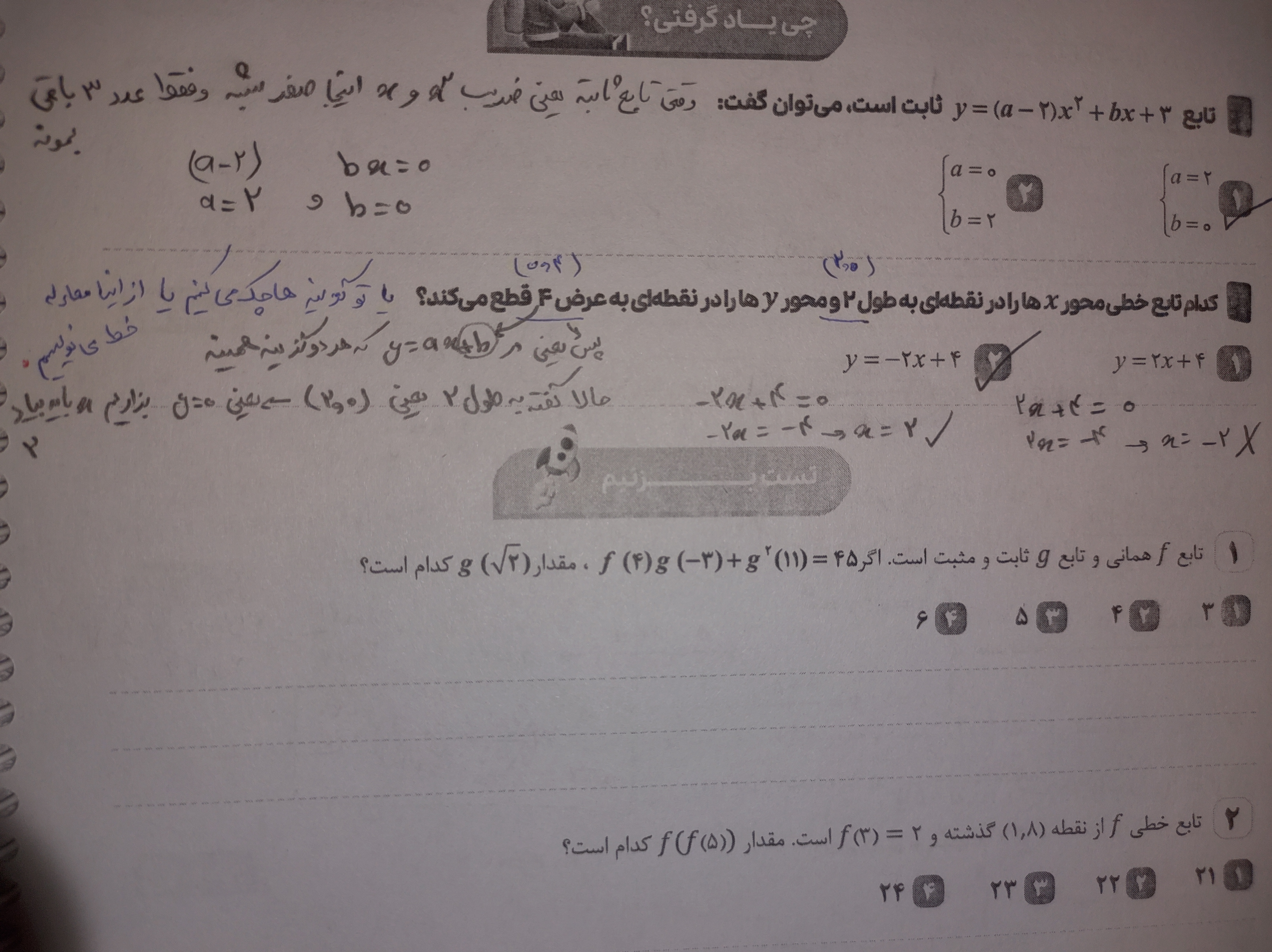 سلام ببین باید x ها رو صفر کنی تا ثابت بشه توی قسمت a میشه a-2=0 => a=2 قسمت b هم صفر بدی درسته پس جواب میشه گزینه 1
